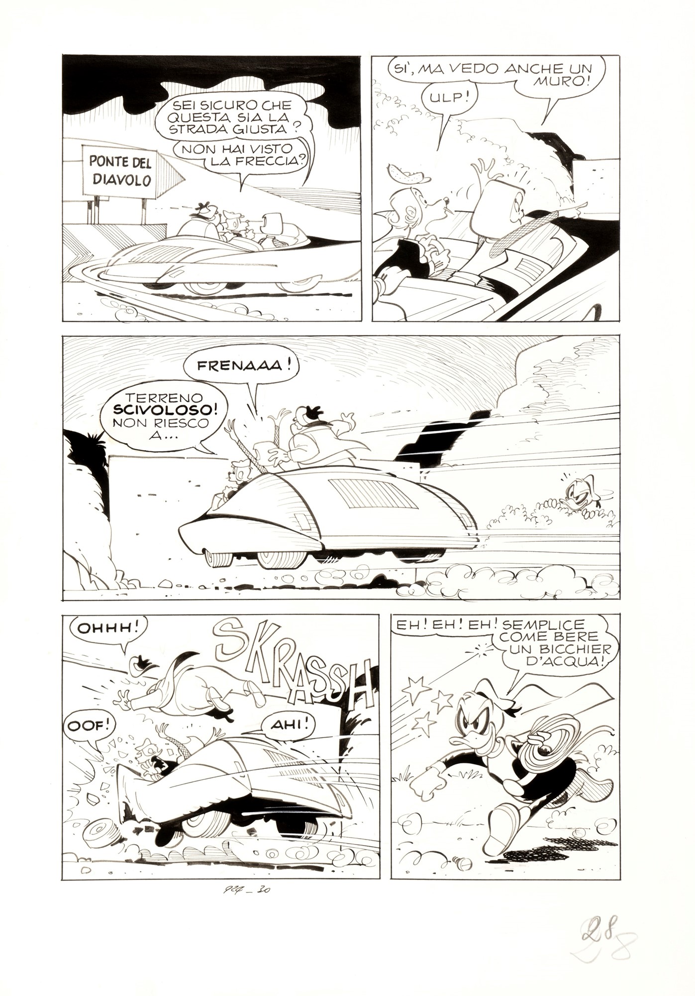 Tavola originale realizzata da Cavazzano per "Paperinika contro Paperinik", edita su Topolino n. 924 a pag. 28 nell´Agosto 1973. Dopo un esordio di stampo "scarpiano", lo stile di Cavazzano si personalizza sempre di più e negli anni '70 acquisisce un dinamismo assolutamente inedito nelle storie di paperi e topi, questa pagina ne è l'assoluta dimostrazione. Seconda storia in assoluto disegnata da Cavazzano per Paperinik. Di grande rarità.