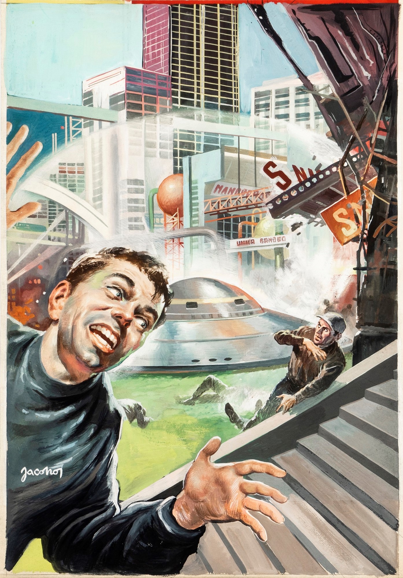 Originale di copertina realizzato da Jacono per il romanzo "Crisi 2000" di Charles Eric Maine, edito nella celebre collana I Romanzi di Urania n. 152 dalla Mondadori nel 1957. A 28 anni Jacono viene chiamato dalla casa editrice milanese per affiancare Curt Caesar nella realizzazione delle copertine de I Romanzi di Urania (successivamente solo Urania) segnando così l’affermazione definitiva del futuro Uomo del cerchio. L’opera qui presentata è la quarta copertina in assoluto realizzata da Jacono per la collana Urania, un pezzo di storia dell’editoria italiana. Firmata.