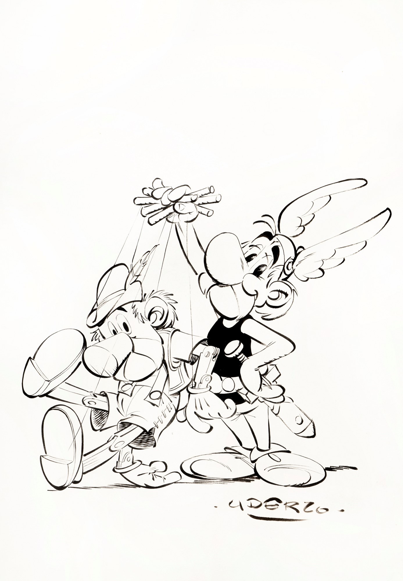 Illustrazione originale realizzata da Uderzo in occasione della mostra "Pinocchio graphis: un naso lungo duecento disegni inediti", tenutasi a Venezia nel 1986, pubblicata sull´omonimo catalogo edito dall´Editrice Montagna nel 1987. Un meraviglioso omaggio del maestro d'oltralpe al Pinocchio di Collodi, in cui il suo Asterix diventa sia burattinaio che burattino. Firmata.