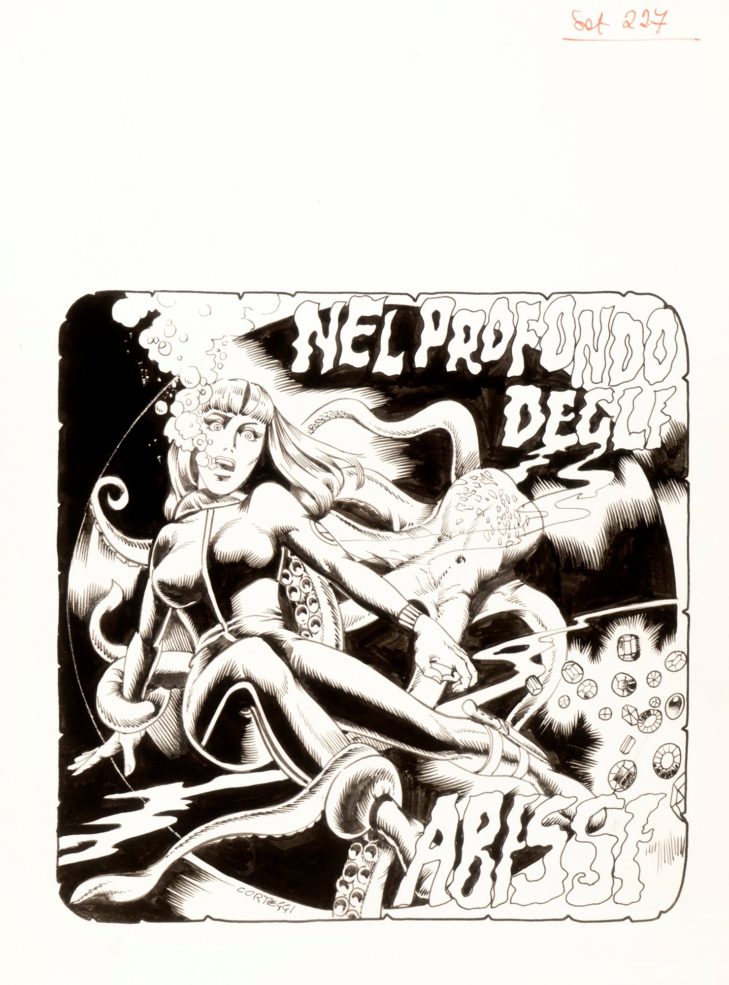 Originale di copertina realizzato da Corteggi per "Nel profondo degli abissi", edito su Satanik n. 226 dalla Corno nel 1974. Colorato al retro a tempera. Firmato.