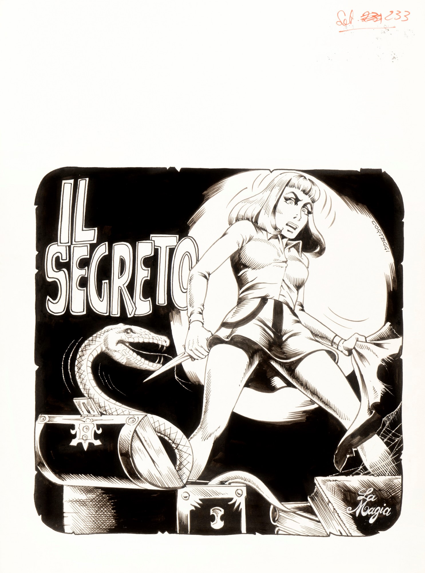 Originale di copertina realizzato da Corteggi per "Il segreto", edito su Satanik n. 230 dalla Corno nel 1974. Colorato al retro a tempera. Firmato.