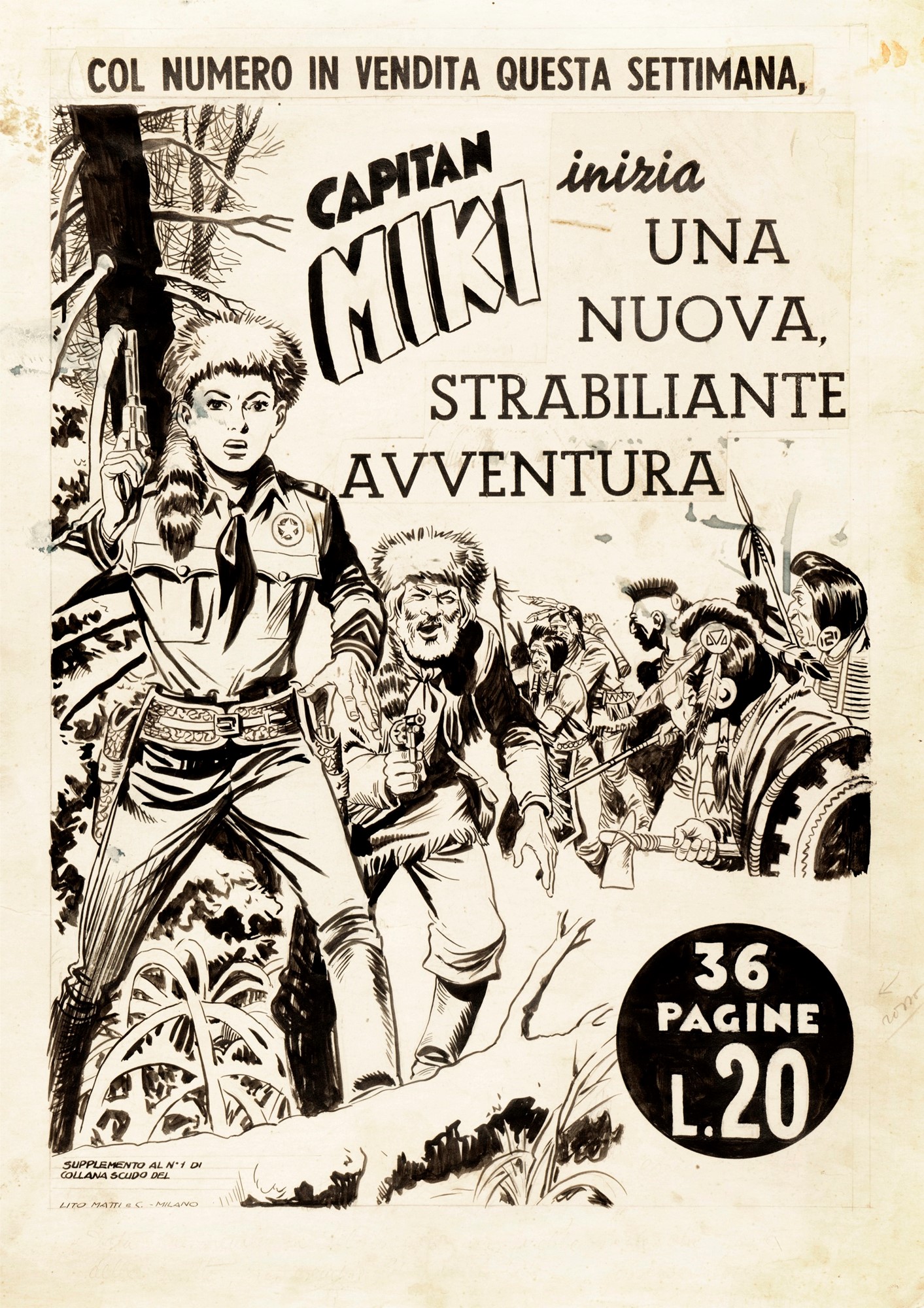 Disegno originale realizzato dalla EsseGesse per un manifesto pubblicitario di Capitan Miki donato ai lettori come supplemento al n. 1 della Collana Scudo durante gli anni '50. Acquerellato al retro. Piccoli strappi e lievi pieghe ai margini.