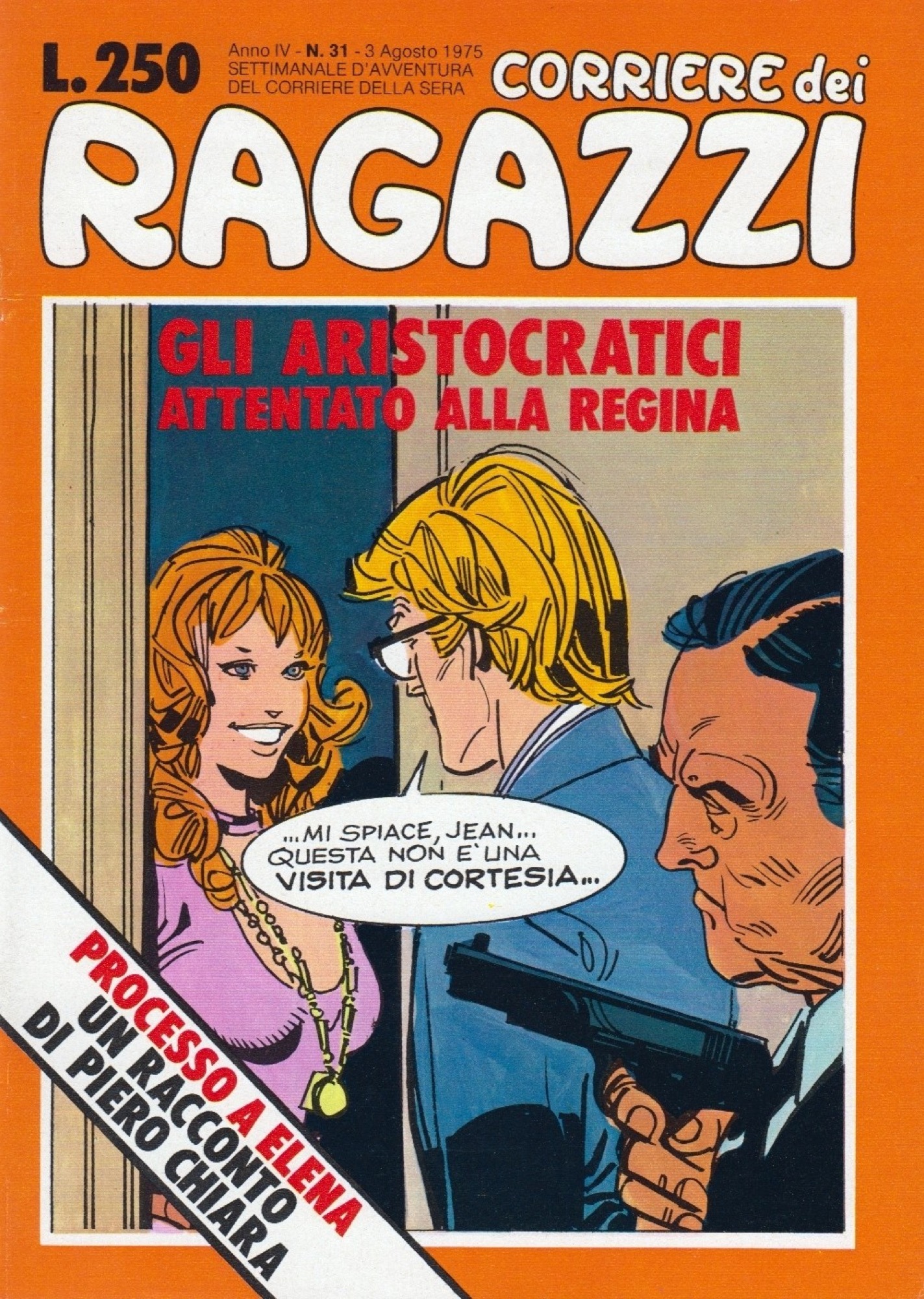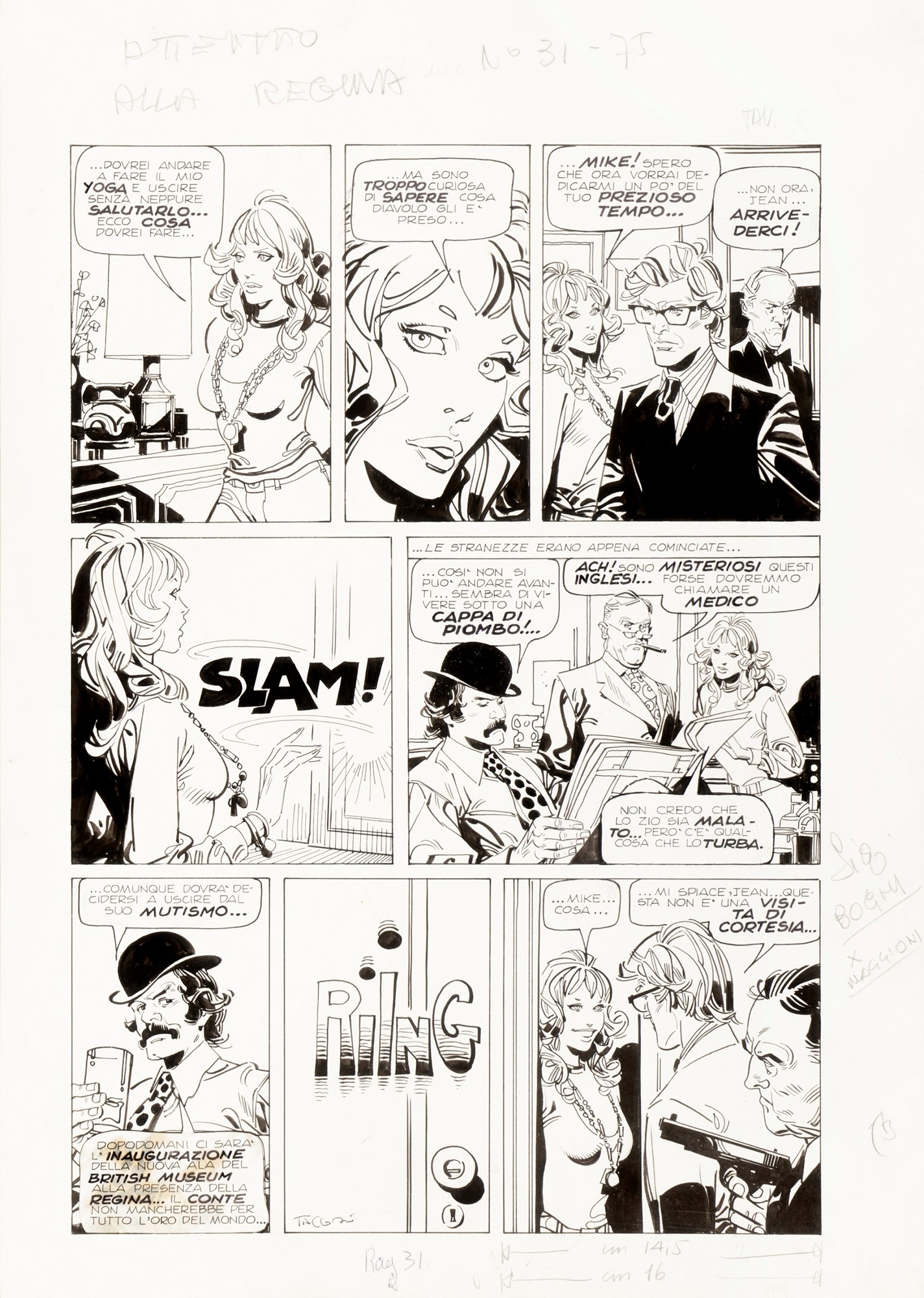 Tavola originale realizzata da Tacconi per "Attentato alla regina", avventura de Gli Aristocratici pubblicata per la prima volta sulle pagine del CdR n. 31 nel 1975. L'ultima vignetta fu usata come copertina. Firmata con timbro editoriale al retro.