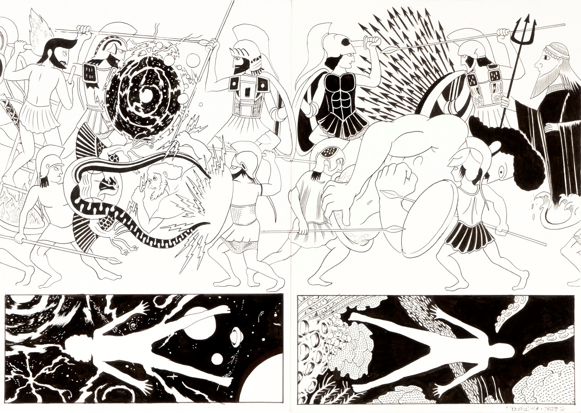 Doppia tavola originale realizzata da Filosa per "Teoria degli opposti", pagg. 8 e 9 di questa affascinante avventura ambientata nel Museo Archeologico Nazionale di Reggio Calabria in cui storia e archeologia si fondono sono il filo conduttore, pubblicata nella collana Fumetti nei Musei dalla Coconino nel 2020. Firmata.
