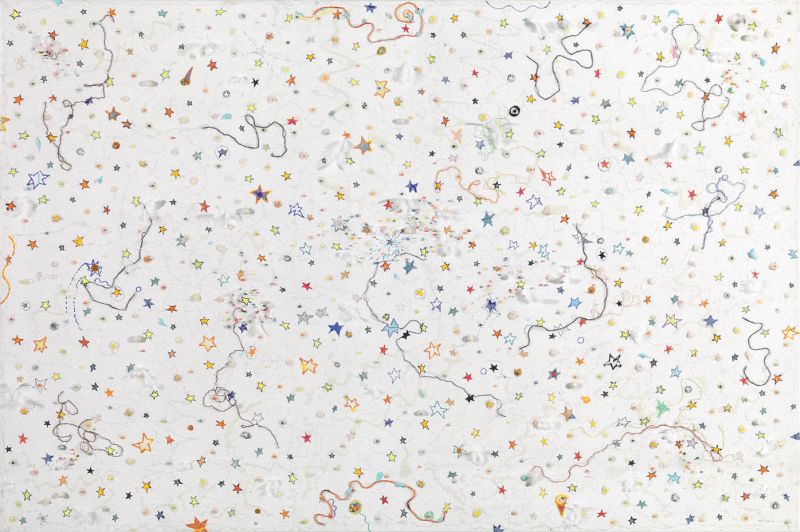 Luca Alinari Firenze 1943 Nemmeno una parola, 1973 Tecnica mista su tela, cm. 100,5x150,5 Firma in basso a destra: Alinari; al verso sulla tela data, titolo e firma: '73 / titolo / Nemmeno / una parola / Alinari: scritta su un cartiglio: Nemmeno una parola / Si parla dell'opera / nel catalogo, in una conversazione con / Edoardo Sanguineti; dedica sul telaio.