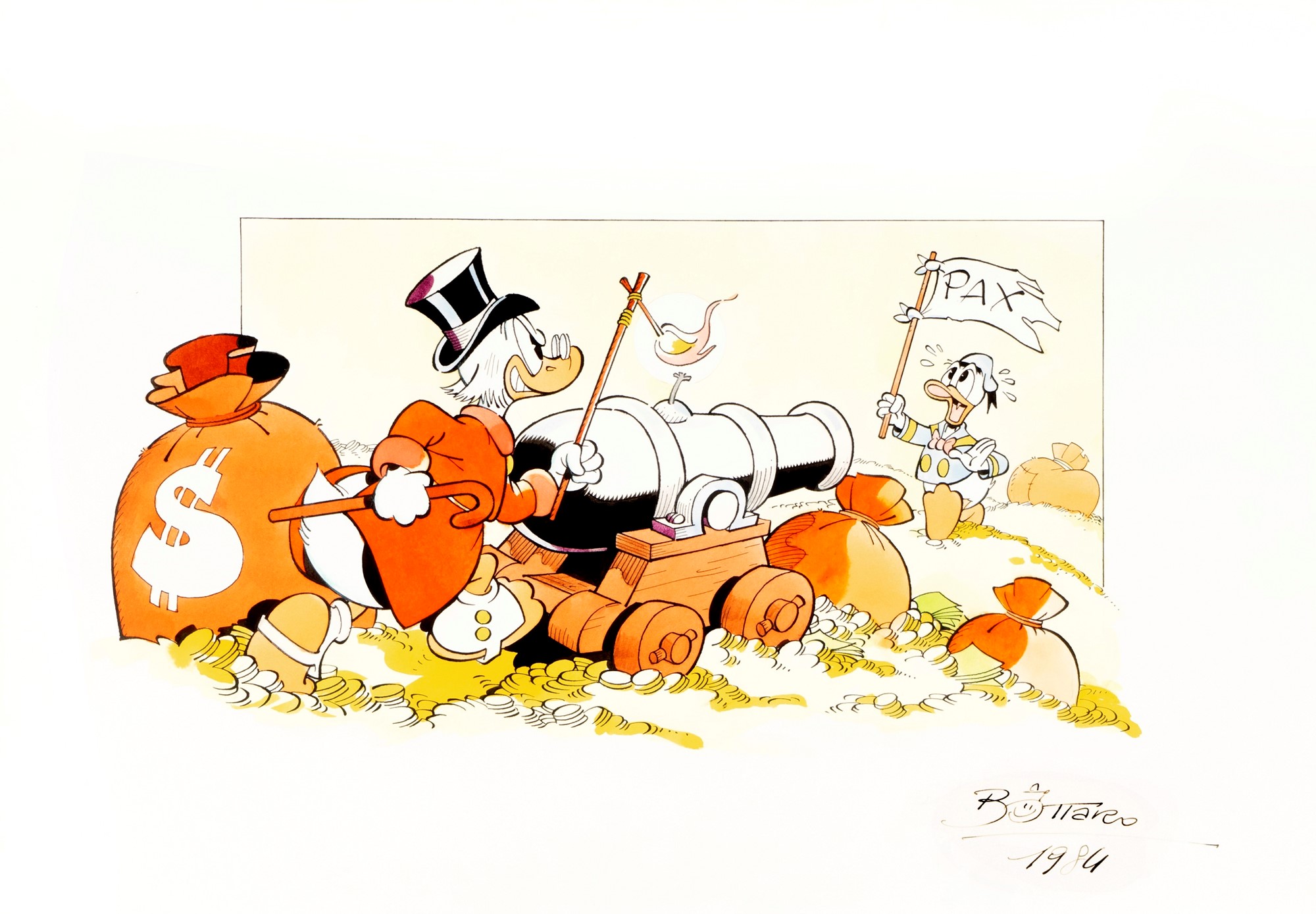 Illustrazione originale realizzata da Bottaro nel 1984, un'immagine iconica all'interno del deposito di Paperone. Firmata e datata.