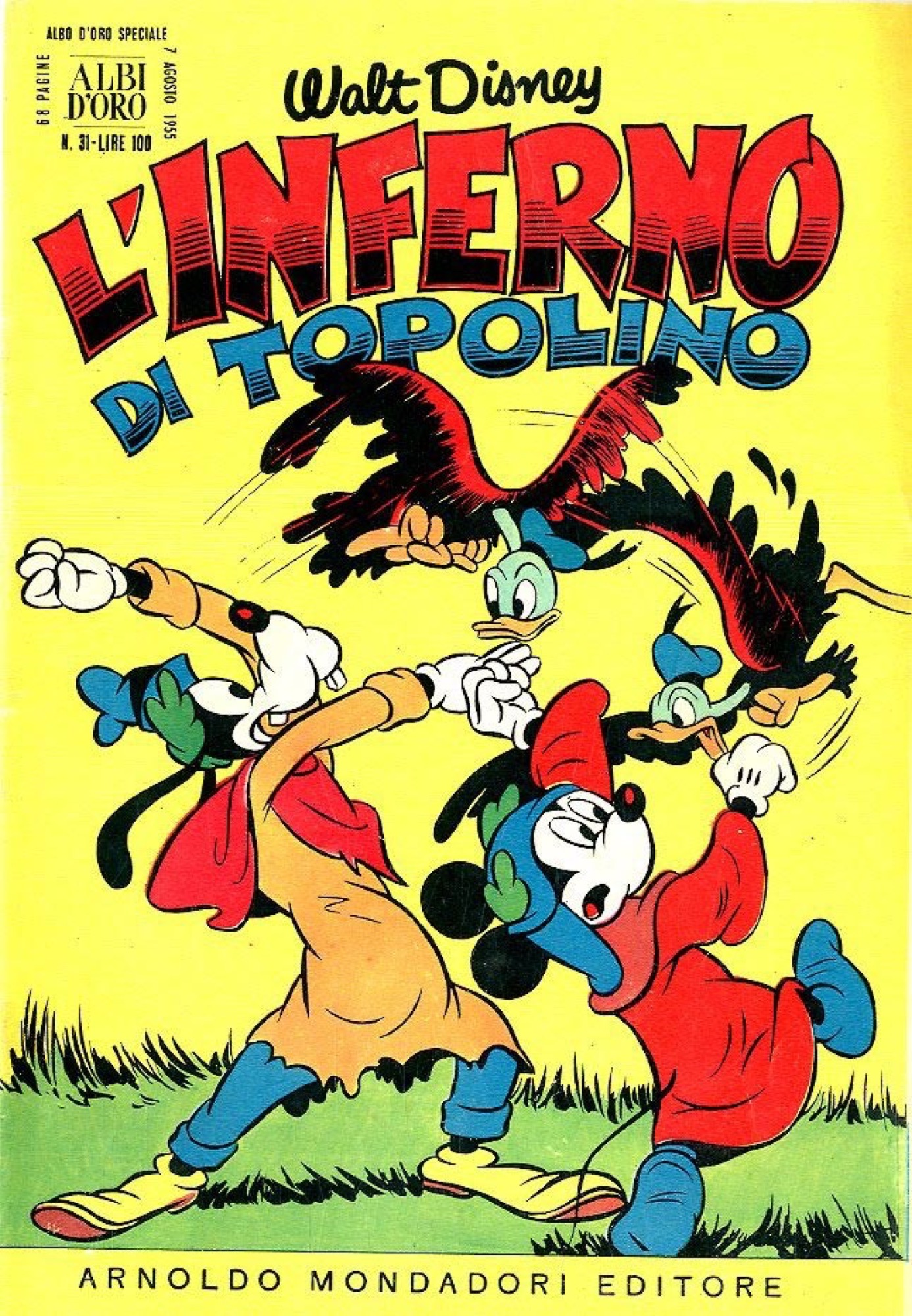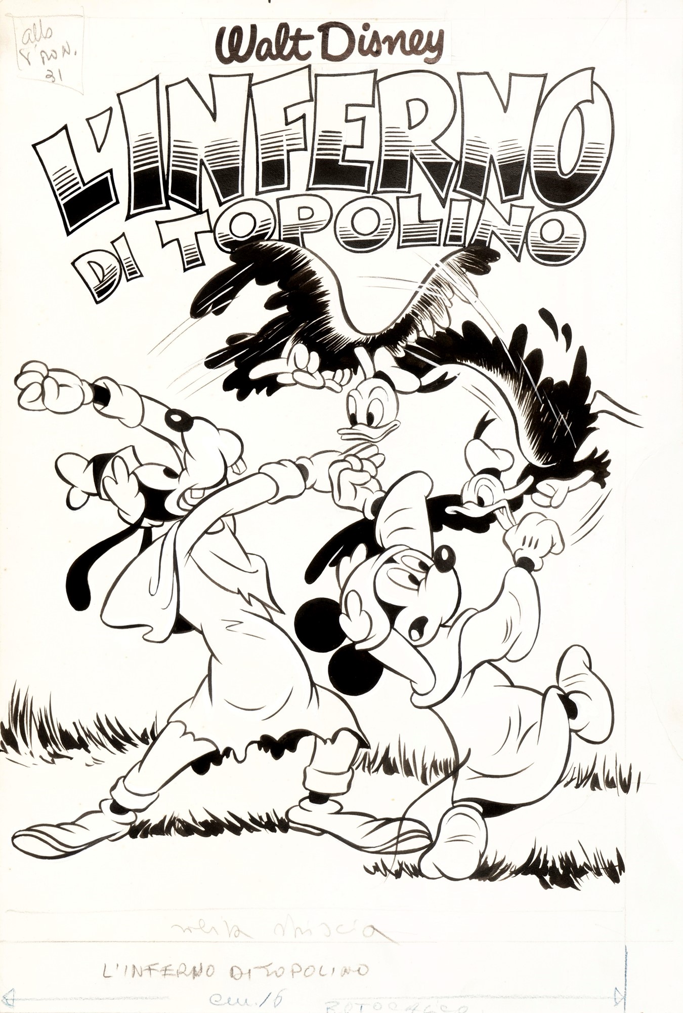 Originale di copertina realizzato da Rubino per "L'Inferno di Topolino", prima copertina in assoluto dedicata al capolavoro di Bioletto, pubblicata in occasione della prima ristampa integrale della storia sugli Albi d'oro n. 31 nel 1955. Pieghe al margine destro.