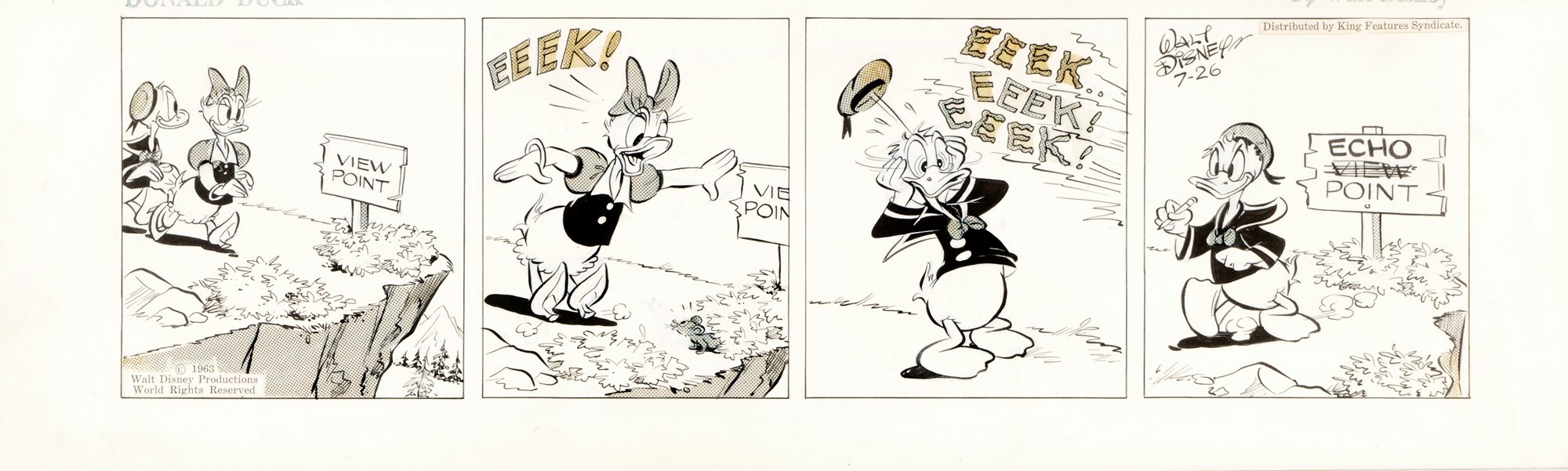 Striscia giornaliera del 26/07/1963 per "Donald Duck". Firmata Walt Disney e datata.
