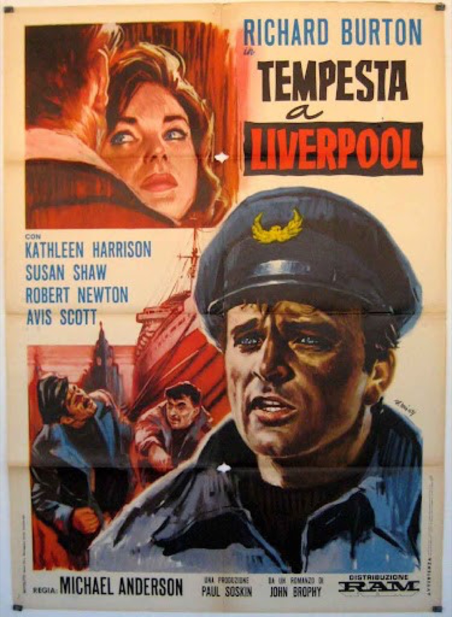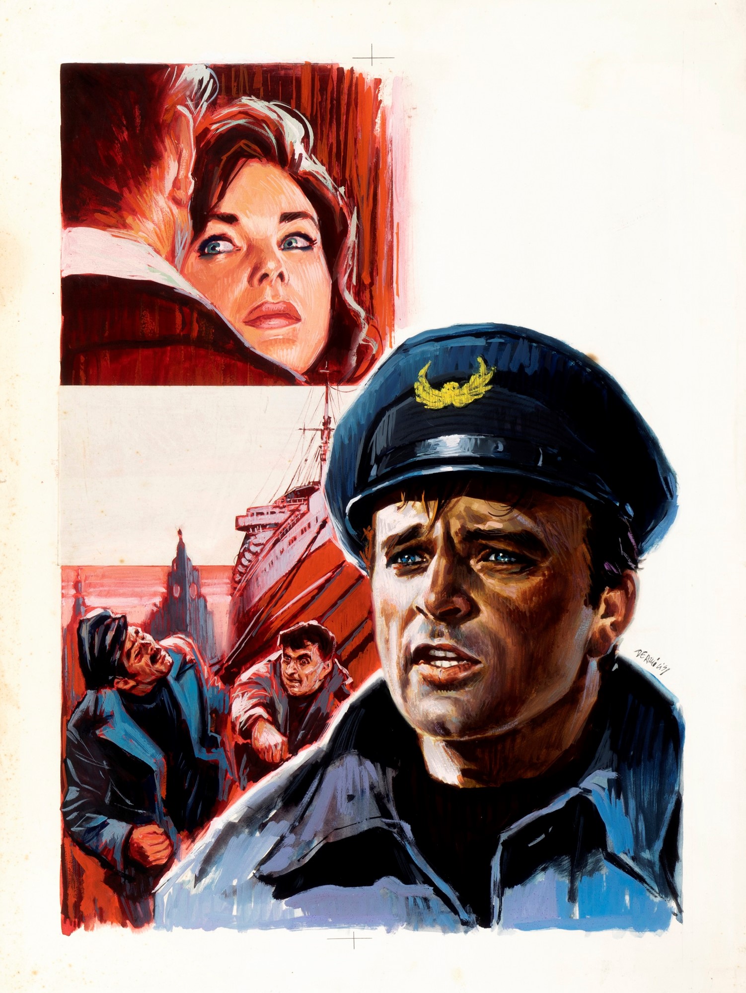 Bozzetto originale realizzato da De Amicis per la locandina ufficiale del film "Tempesta a Liverpool", diretto da Michael Anderson con Richard Burton e Kenneth Griffith nel 1950. Lievi pieghe al margine sinistro e fori di affissione agli angoli. Firmato.