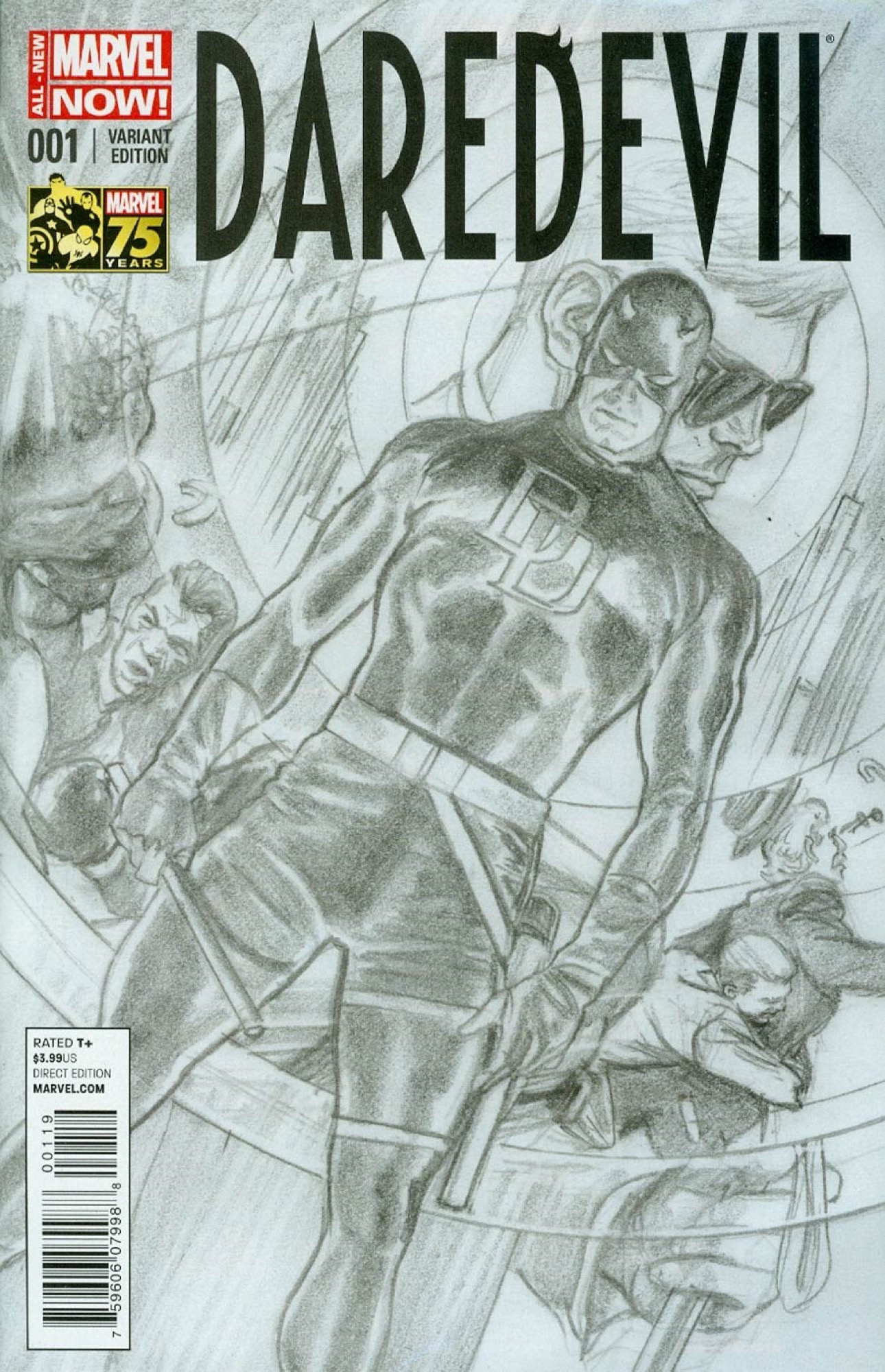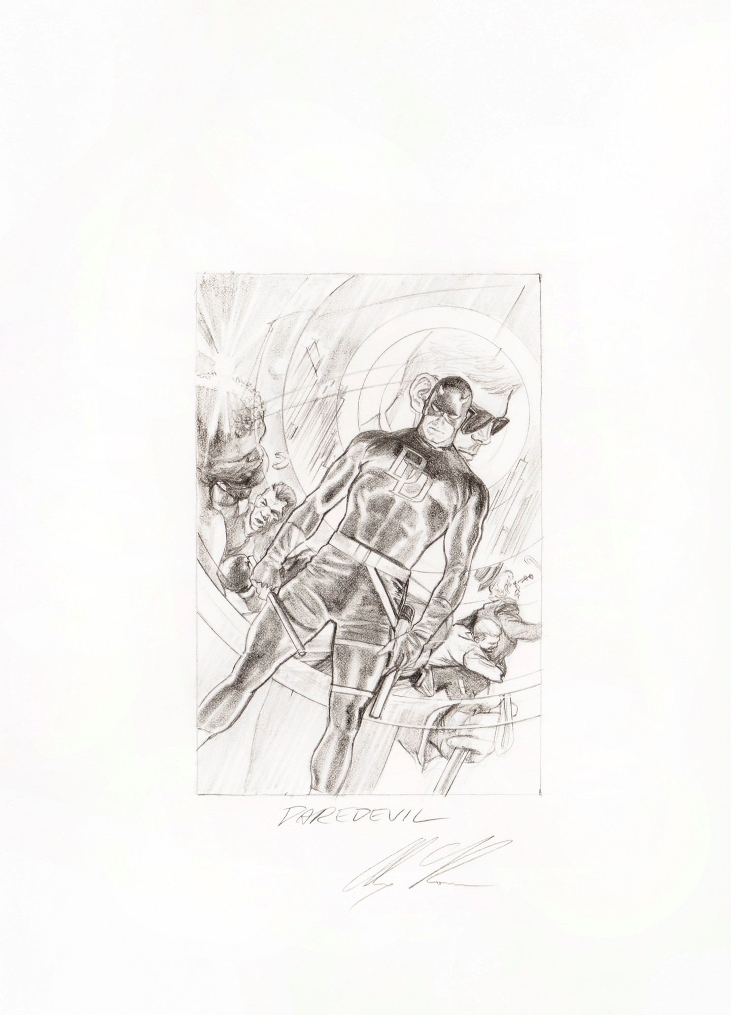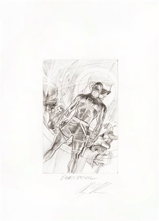Originale di copertina (variant cover) realizzato da Ross per "Daredevil" n. 1 edito dalla Marvel nel 2014. La presente opera fu ideata da Ross per celebrare i 75 anni della Marvel Comics e fu pubblicata, nella versione definitiva a colori, per il poster celebrativo nel 2014 e successivamente per la copertina di "Daredevil Omnibus" vol. 1 nel 2017. Firmato.
