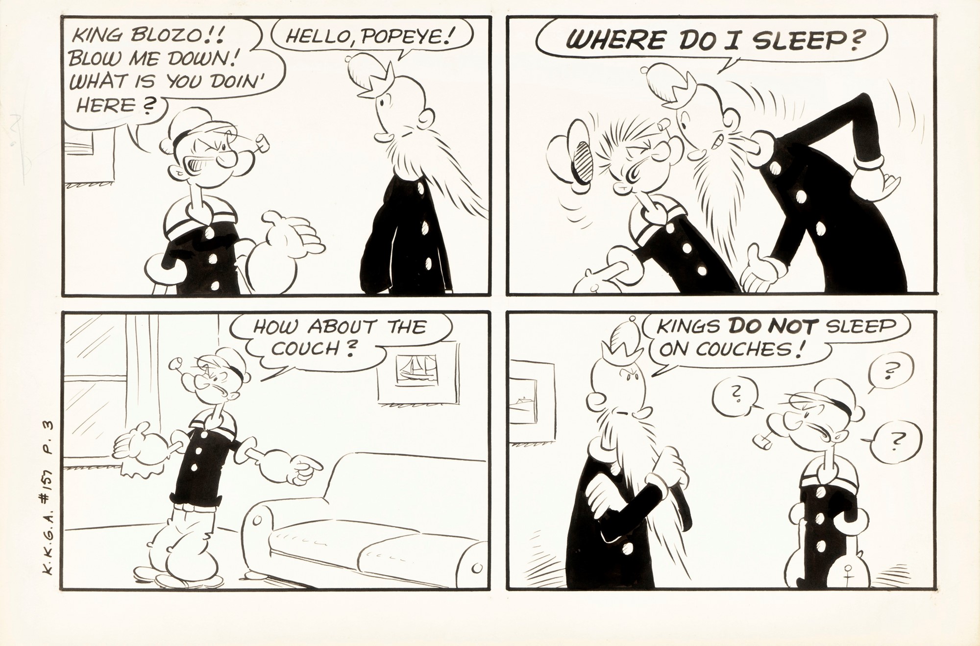 Tavola originale realizzata da Sagendorf per "House Boat", avventura in formato comic book orizzontale di Popeye pubblicata su Boys' and Girls' March of Comics n. 157 a pag. 3 dalla K.K. Publications nel 1957.