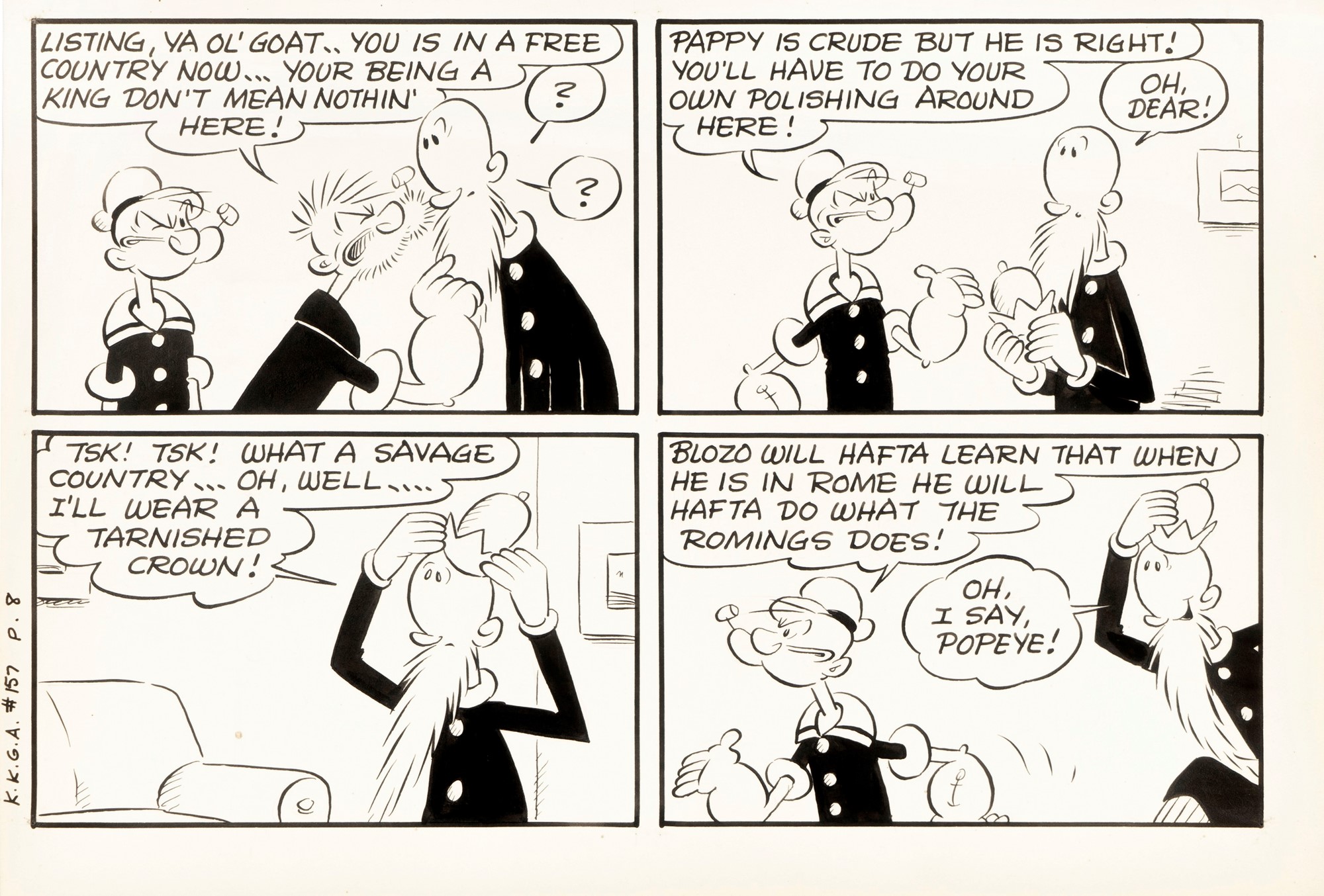 Tavola originale realizzata da Sagendorf per "House Boat", avventura in formato comic book orizzontale di Popeye pubblicata su Boys' and Girls' March of Comics n. 157 a pag. 8 dalla K.K. Publications nel 1957.