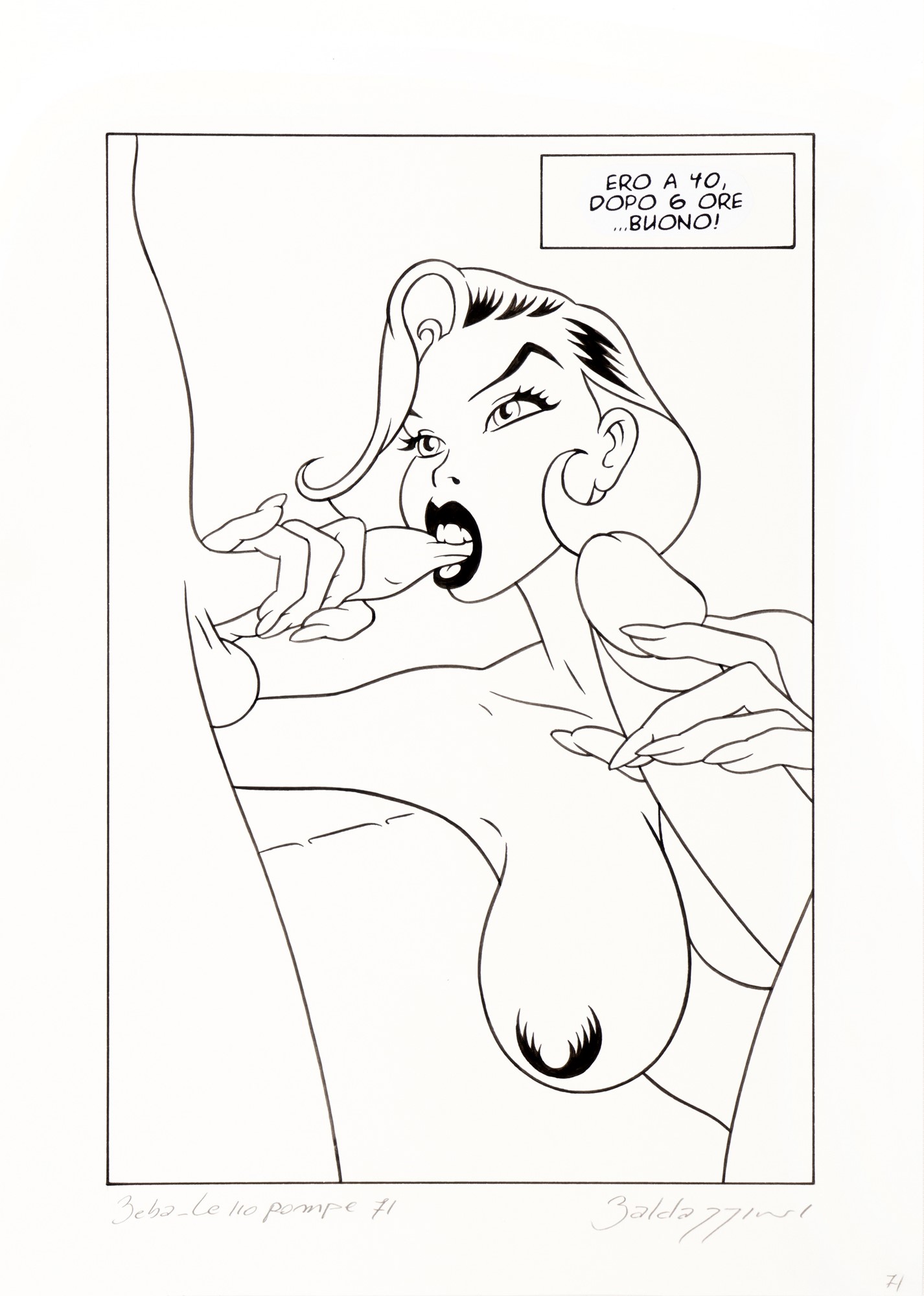 Tavola originale realizzata da Baldazzini per "Beba: Le 110 pompe", edita a pag. 71 dalla Kappa Edizioni nel 2006. Firmata e titolata.