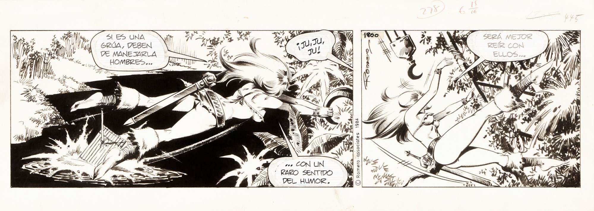 Striscia giornaliera n. 1800 del 1984 per “Axa”. Striscia fantascientifica edita sul Sun dal 1978 al 1986, creata dal maestro spagnolo Romero. Timbro editoriale del Sun al retro. Firmata.