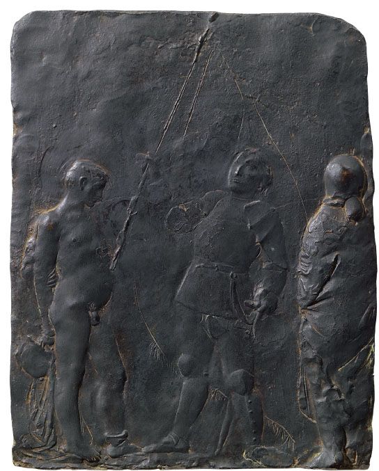 Giacomo Manzù Bergamo 1908 - Ardea (Roma) 1991 Santa Giovanna d'Arco con San Giorgio e Santa Giustina, 1956 Bassorilievo in bronzo, esemplare unico, cm. 40,5x32,5 Al verso, entro un cartiglio: Manzù / "Bassorilievo" / Bronzo / 1956 / "S. G. d'Arco con S. Giorgio / e S. Giustina"; al verso sulla cornice: etichetta Manzù 1908 - 2008, con dati dell'opera: etichetta Giacomo Manzù / Mostra per il Giubileo / Capolavori e opere scelte 1930-1990. Cerificato con foto di Inge Manzù, Ardea, 31 luglio 2007, con n. 8/2007.
