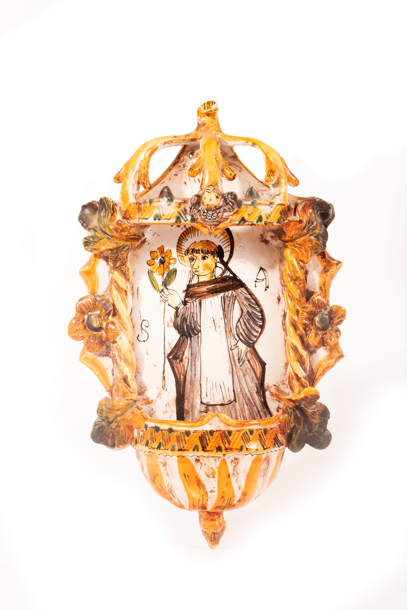 Lotto di tre acquasantiere e due formelle in ceramica policroma, secolo XX
