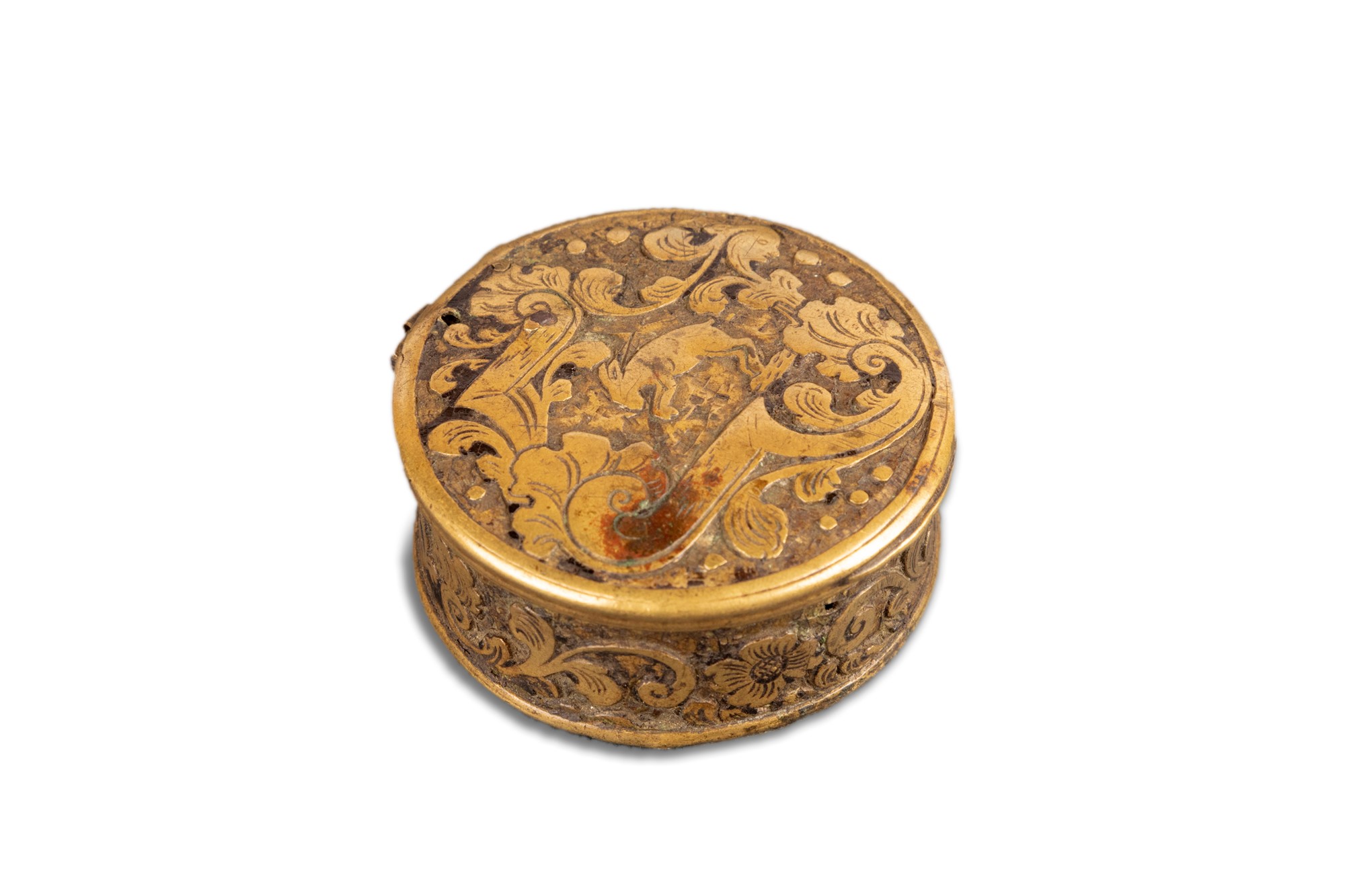 Antica scatolina circolare in bronzo finemente incisa con motivi vegetali e leprotto