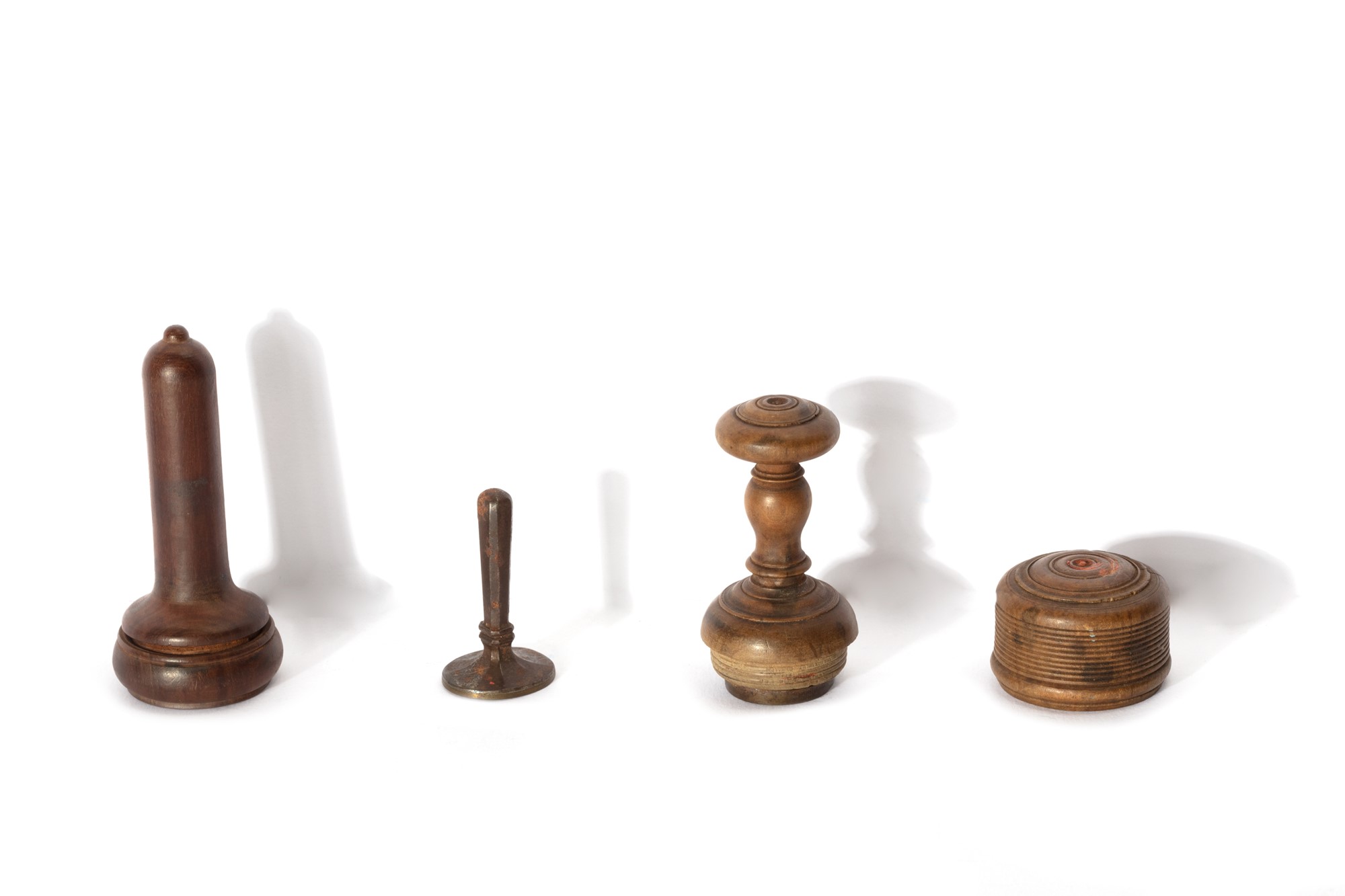 Due sigilli in ferro con custodia in legno tornito, con stemma nobiliare, secoli XVII - XVIII