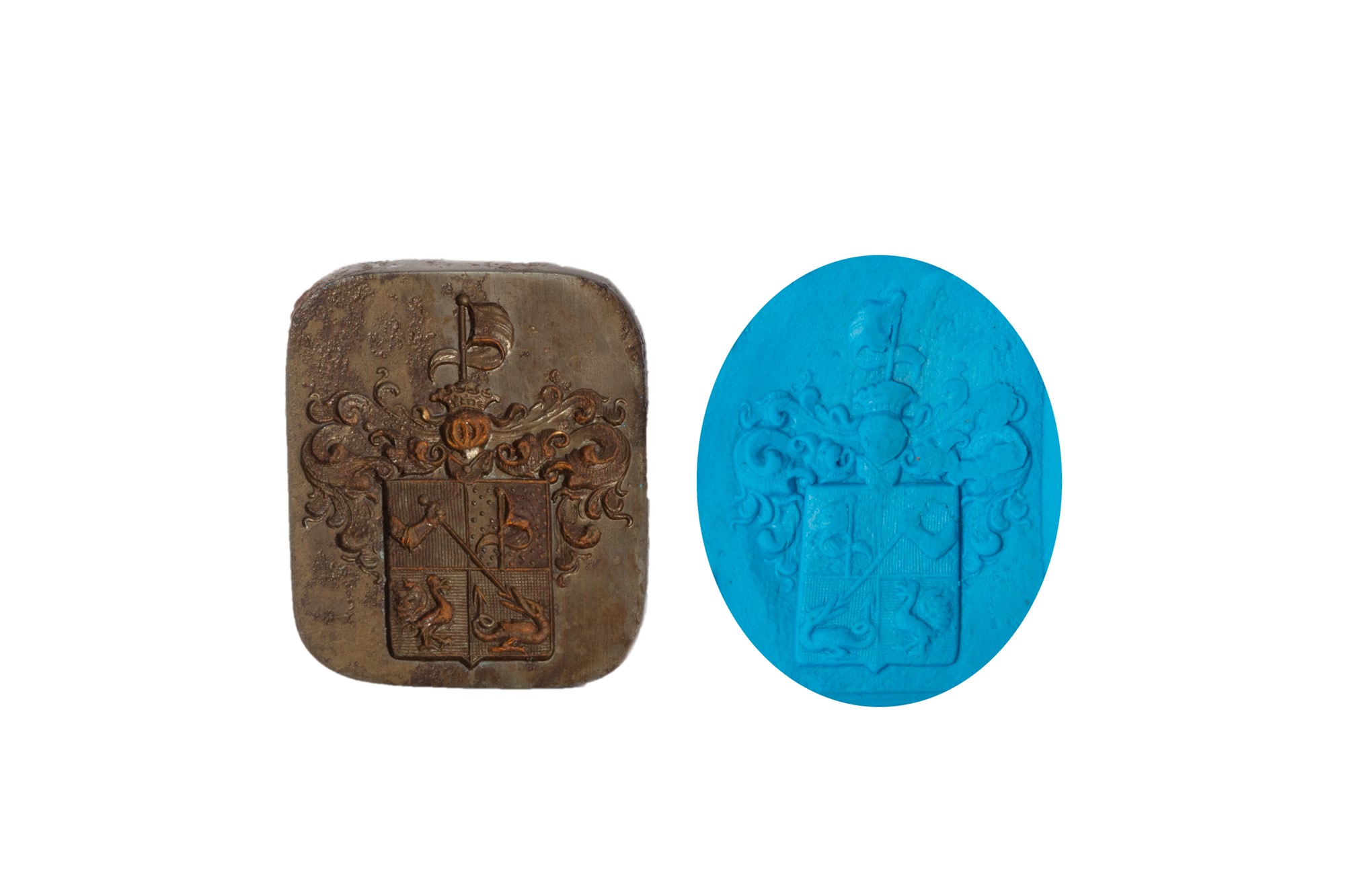 Due sigilli in ferro con manico in legno ebanizzato nero, con stemmi nobiliari, secolo XVIII
