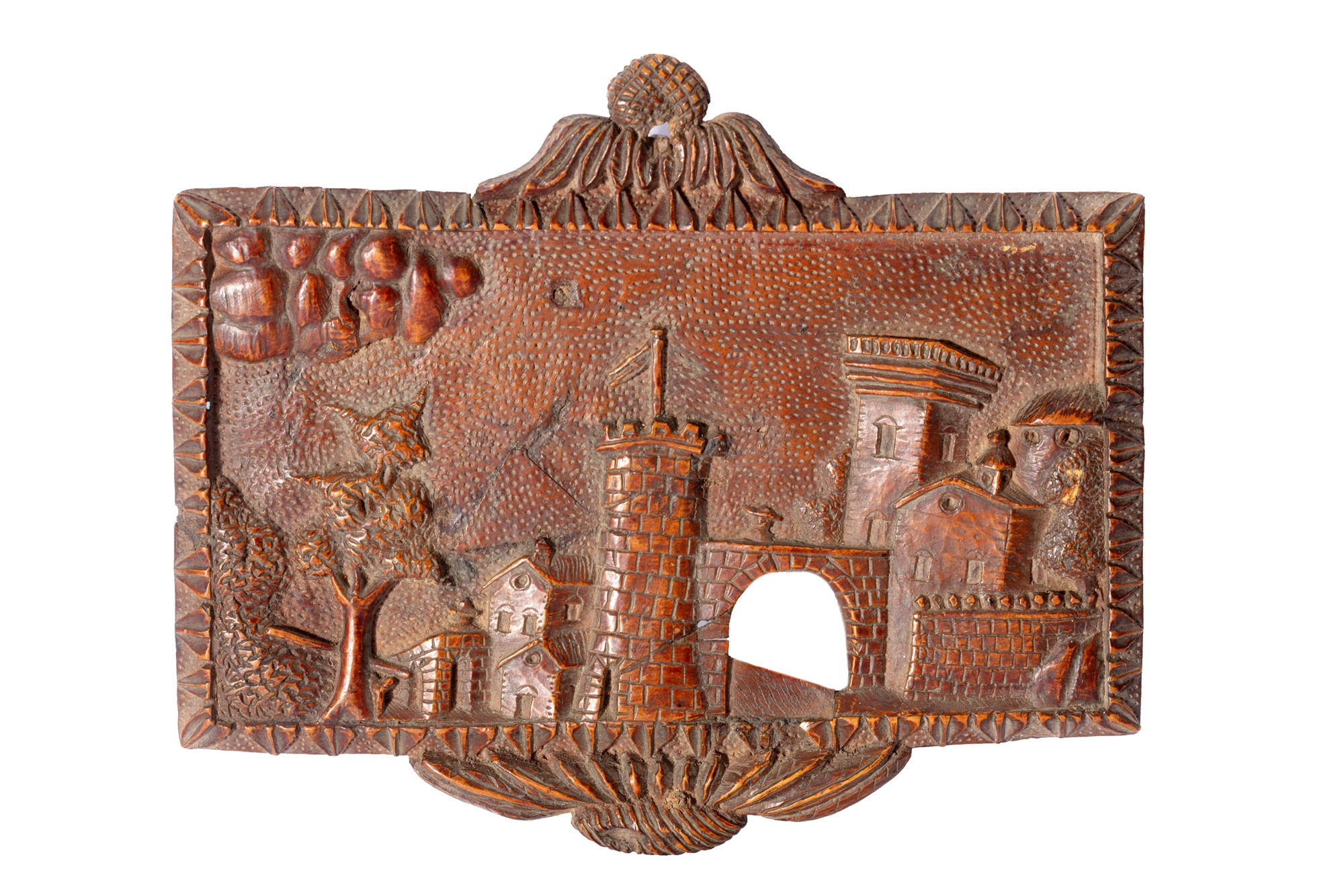 Formella in legno di bosso con bassorilievo raffigurante città fortificata, secoli XIV - XV