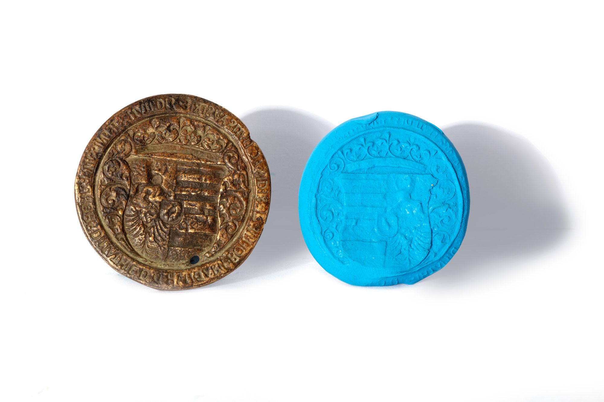 Grande sigillo circolare in bronzo con stemma nobiliare e iscrizione, secoli XIV - XV