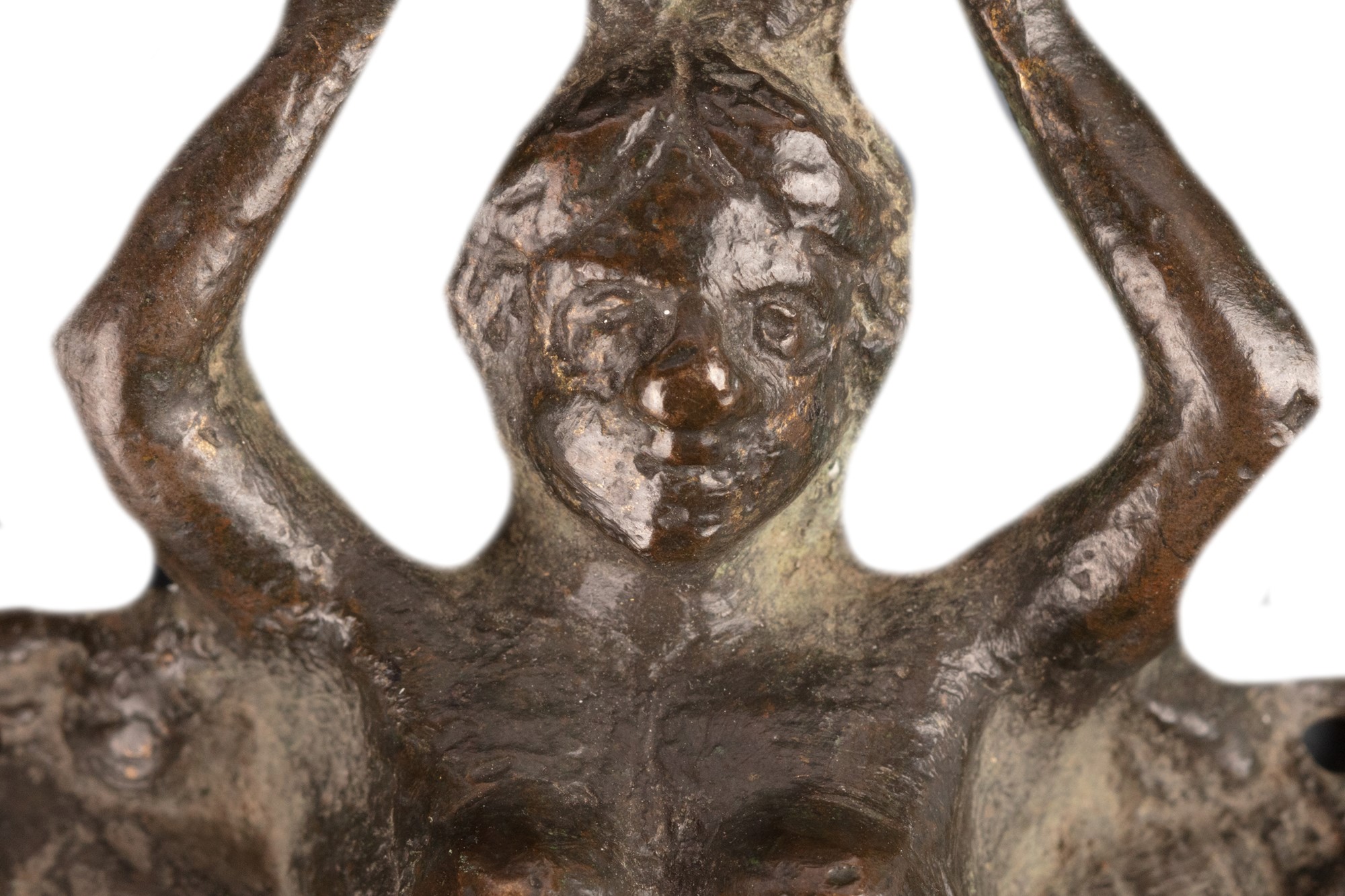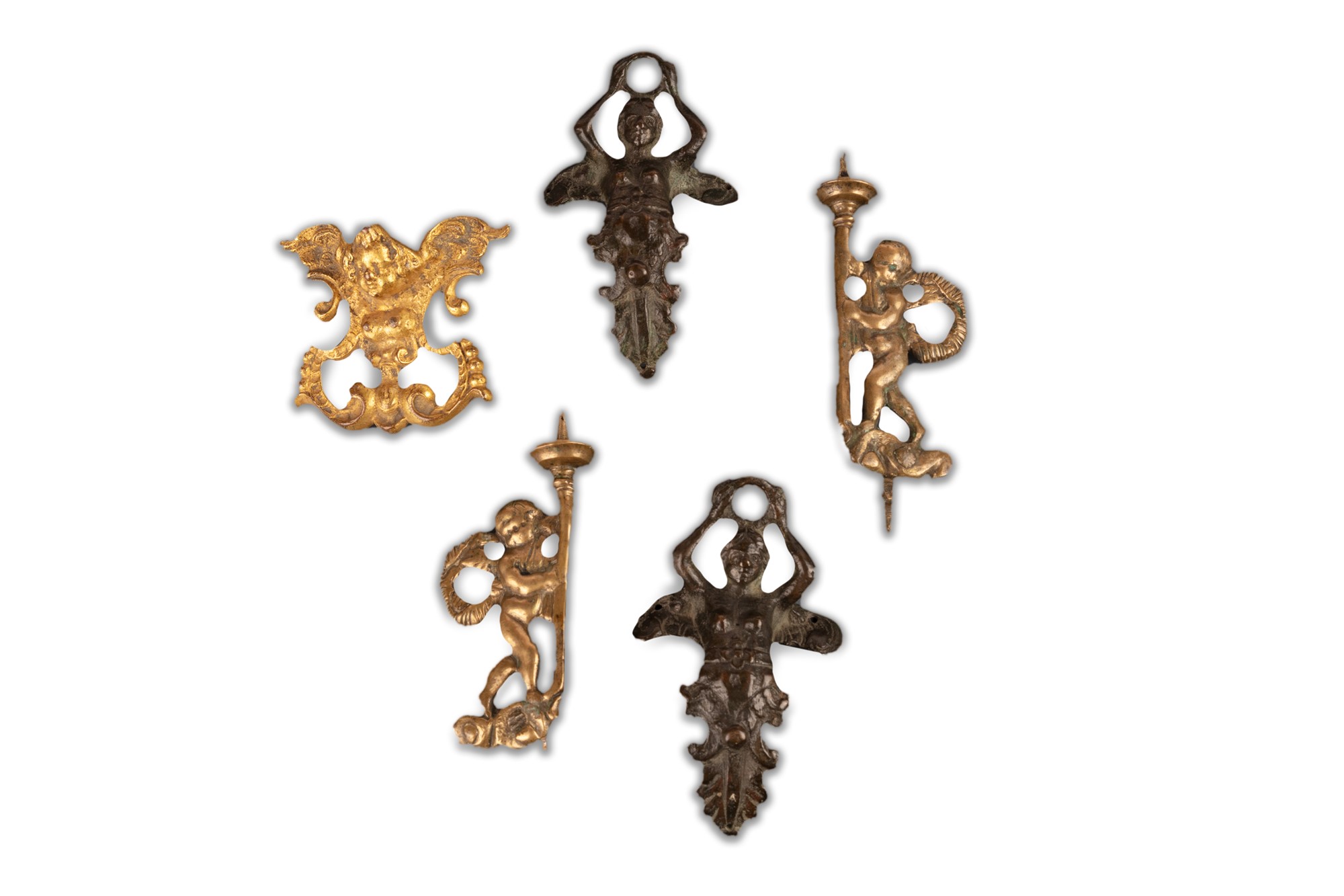 Lotto composto da cinque antichi oggetti in bronzo: tre maniglie e due porta candele