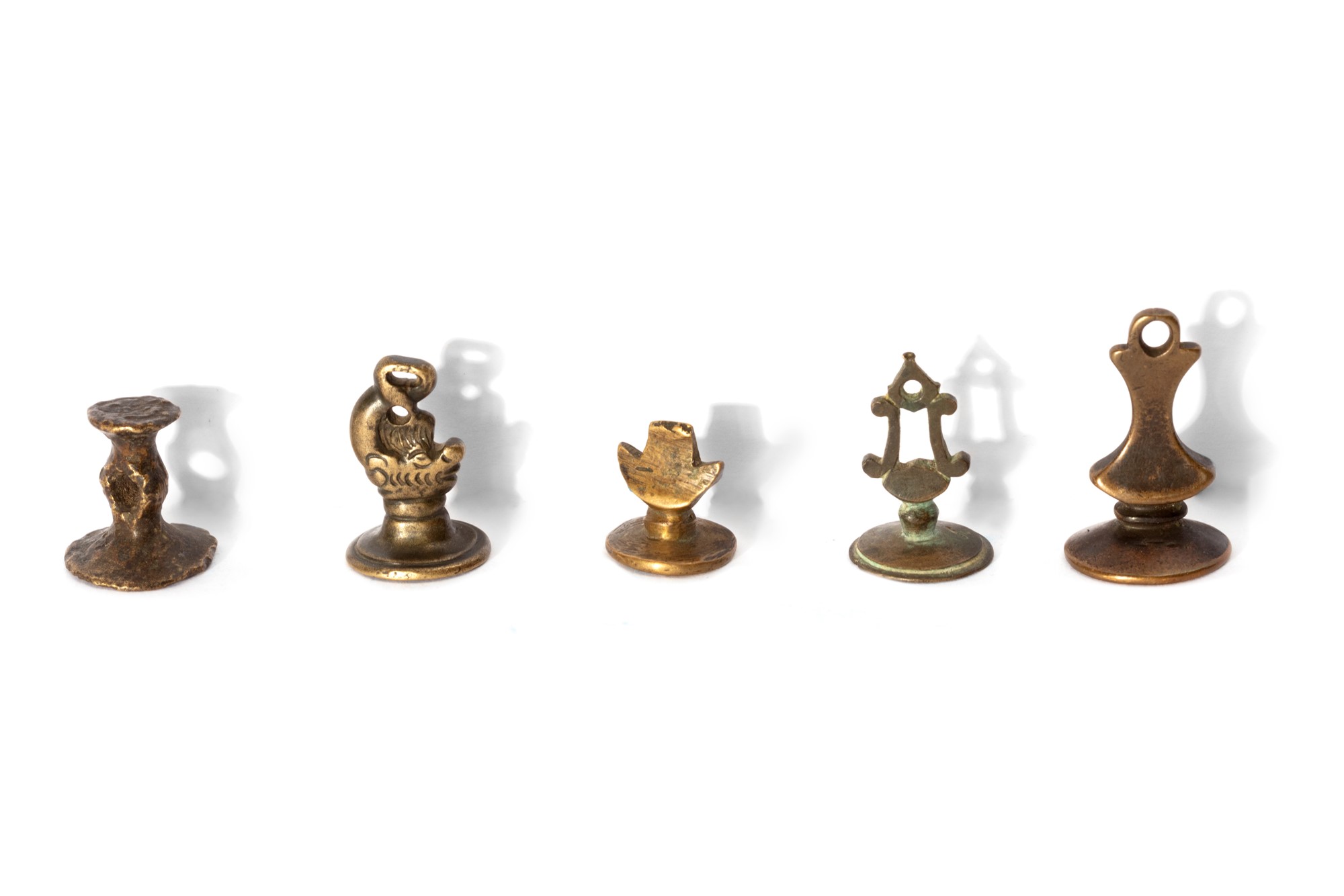 Lotto composto da cinque sigilli di cui tre a pendente, in bronzo, con stemmi nobiliari, secolo XVIII