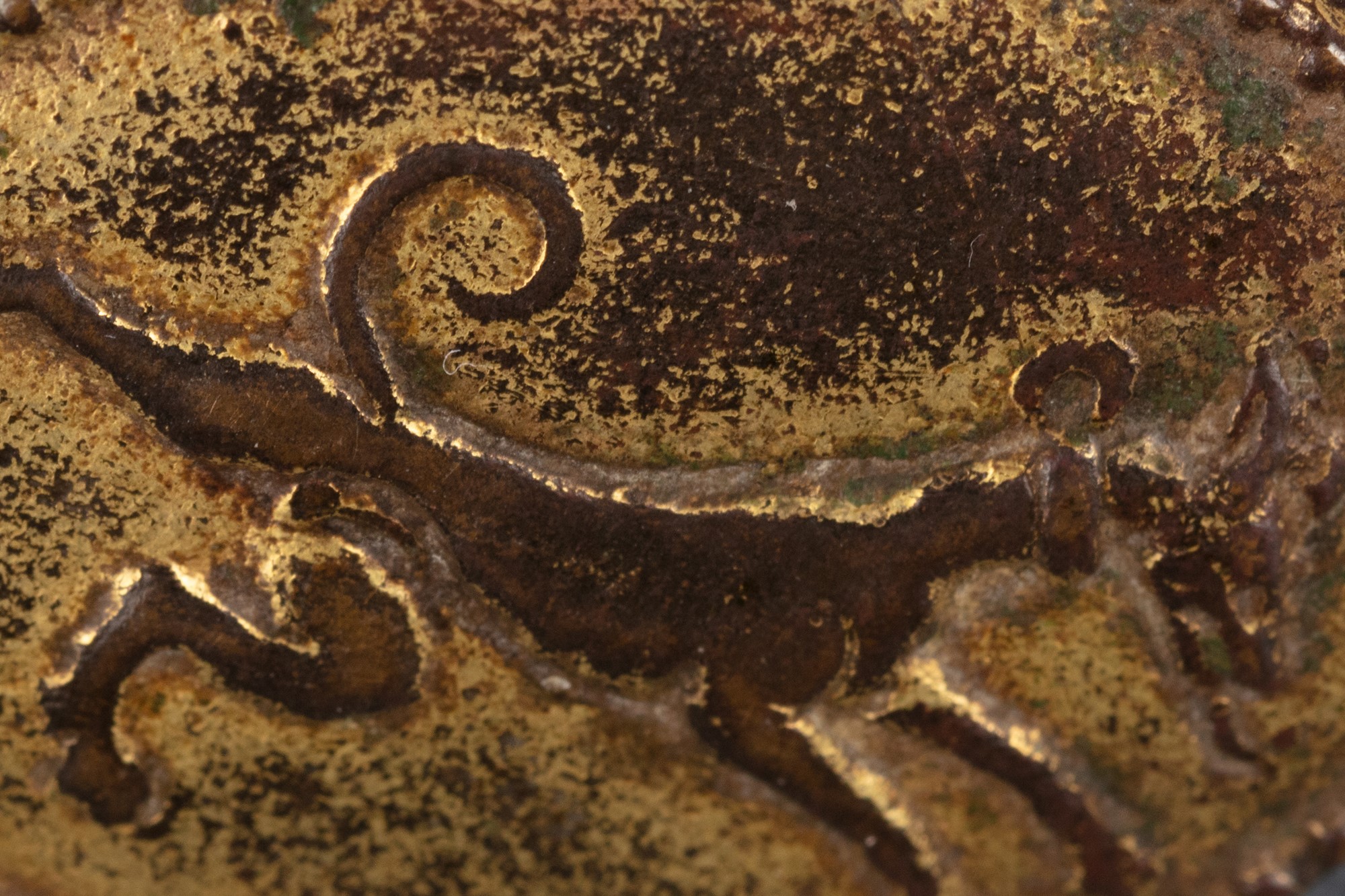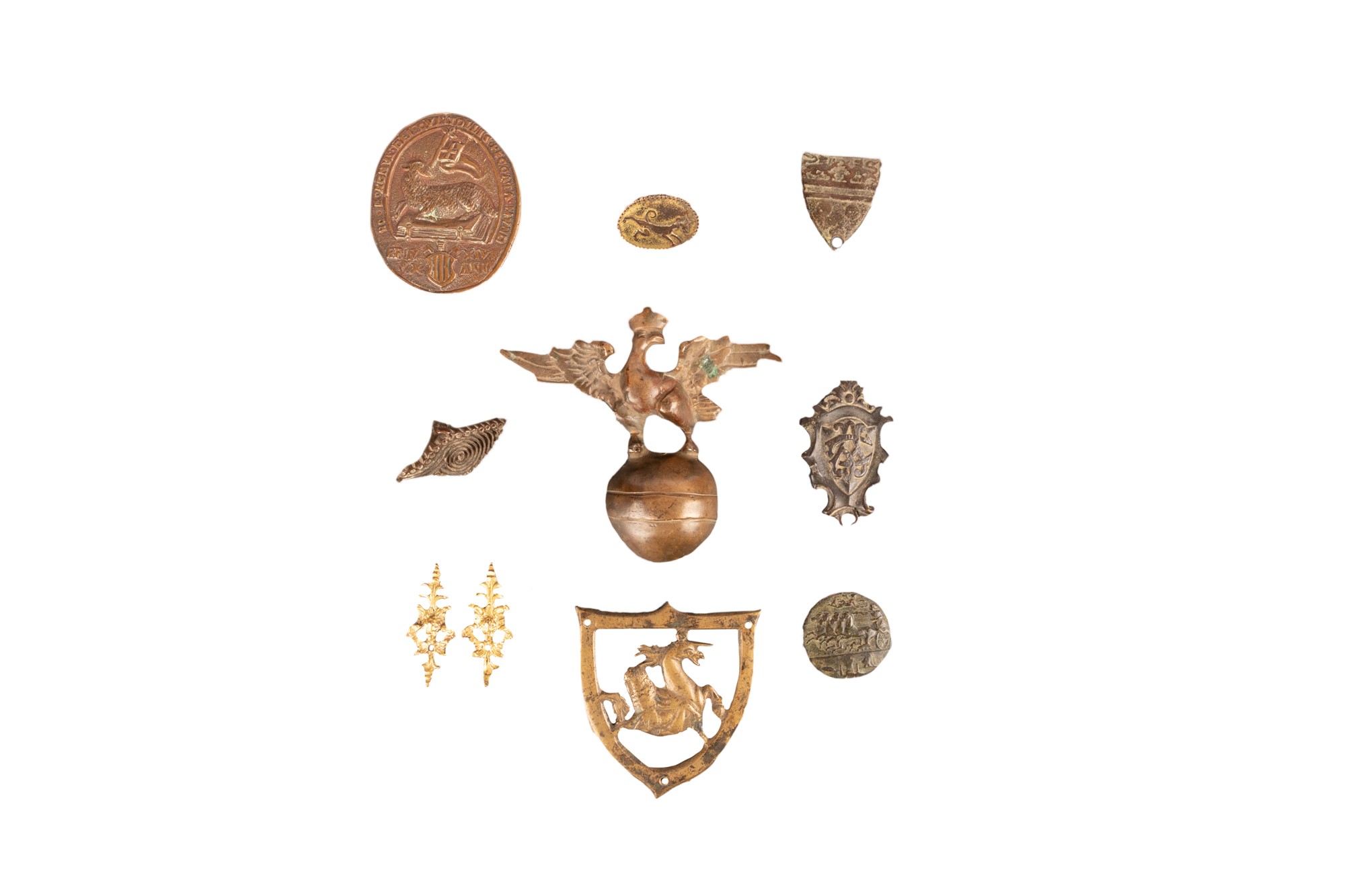 Un'aquila su globo; animale fantastico entro scudo; due elementi di mobile in bronzo dorato; un sigillo orientale; pendente a forma di scudo con stemma nobiliare; elemento decorativo ovale con animale rampante; stemma nobiliare con due leoni e tre palle; una medaglia con quadriga e Vittoria alata; placca ovale con agnello mistico sul recto e Madonna con Bambino e Santo al verso;