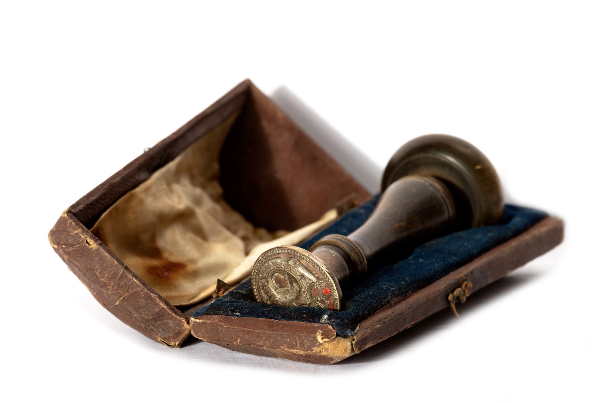 Sigillo in argento con manico in corno tornito entro astuccio originale, con stemma nobiliare, secoli XVIII - XIX