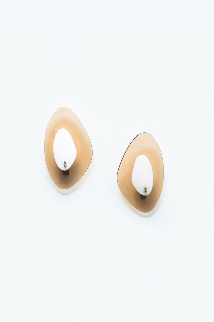 Coppia di appliques in vetro colorato curvato e vetro opalino.