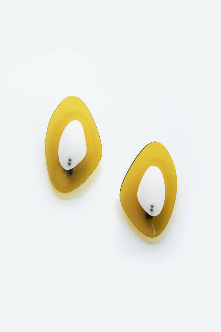 Coppia di lampade a muro in vetro curvato colorato e vetro opalino.