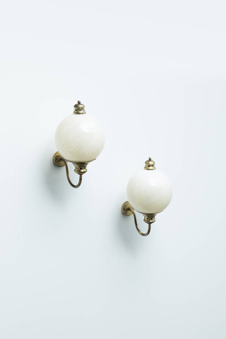 Coppia di lampade a muro in ottone, diffusori in vetro opalino lavorato a fasce trasversali.