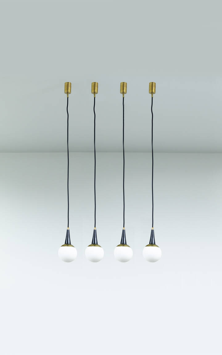 Quattro lampade a sospensione con struttura in legno laccato, ottone e diffusori in vetro opalino. Anni '50
