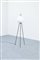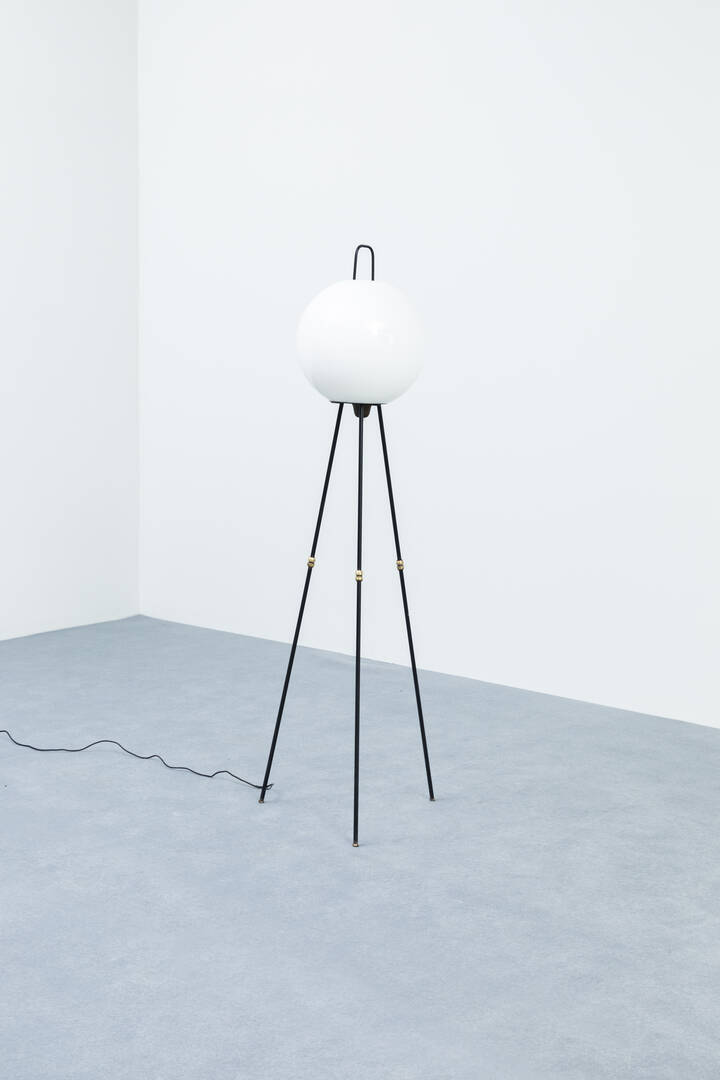 Lampada da terra con sostegno a tripode in metallo verniciato, diffusore in vetro opalino.