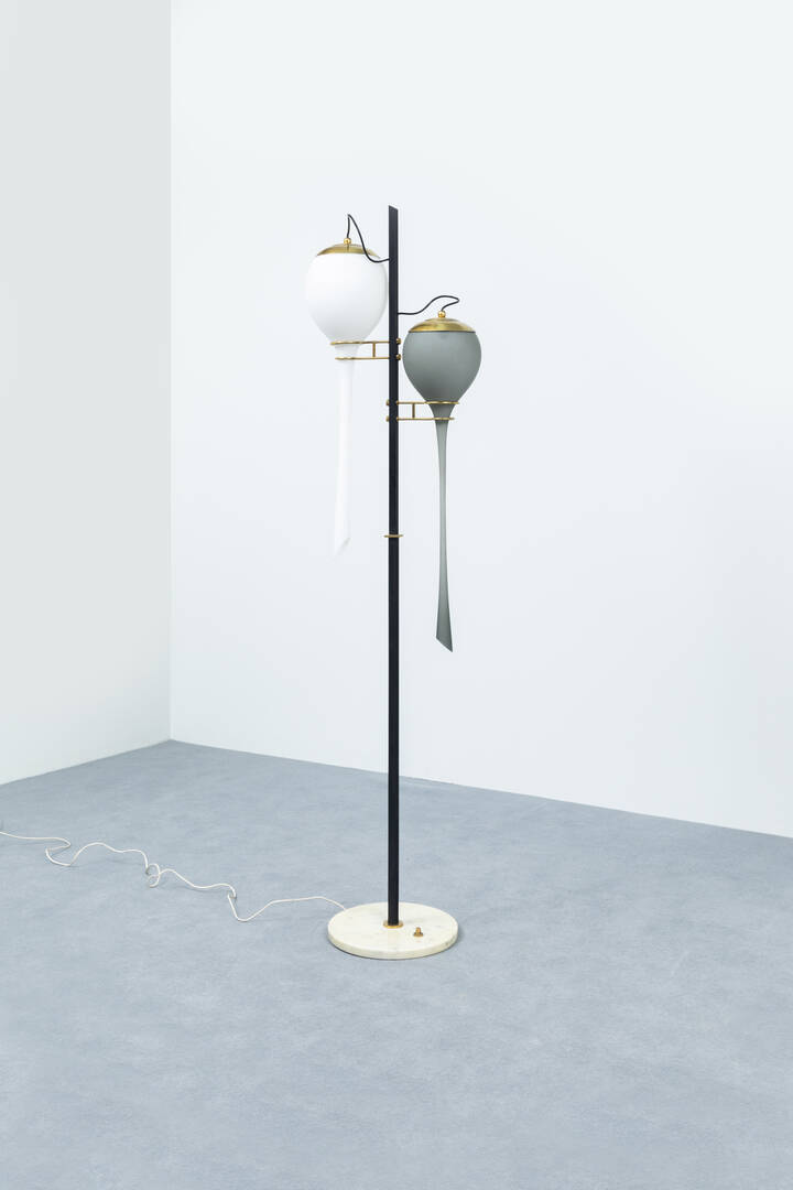 Lampada da terra in metallo verniciato e ottone, diffusori in vetro soffiato e satinato.
