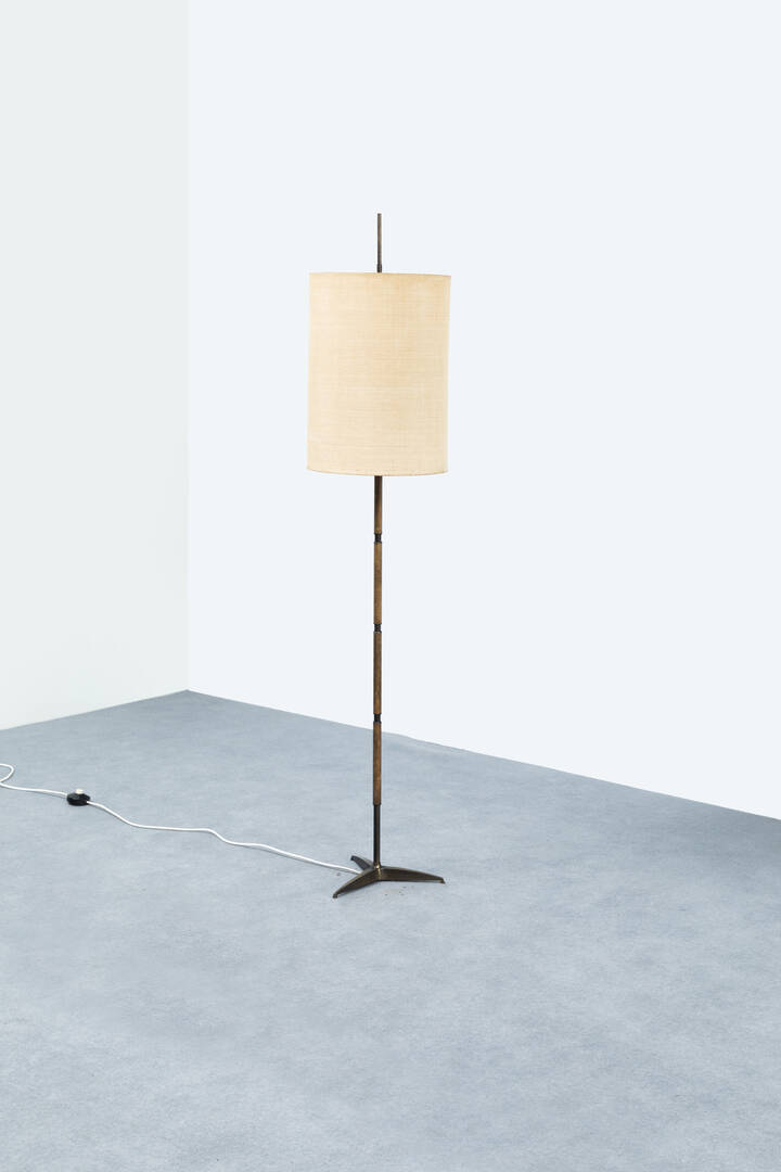 Lampada da terra in ottone, paralume in stoffa.