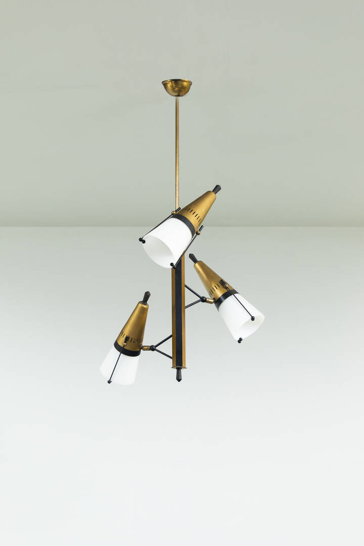 Lampadario con struttura in ottone, diffusori conici in vetro satinato.