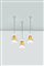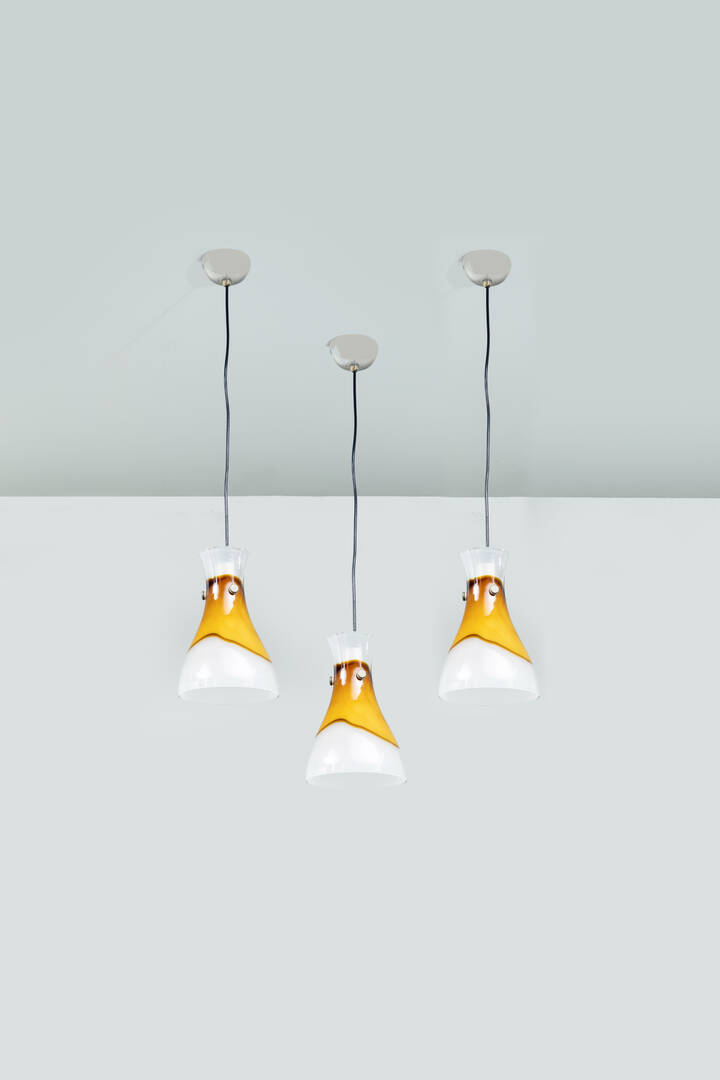Tre lampade a sospensione in vetro a fasce colorate.