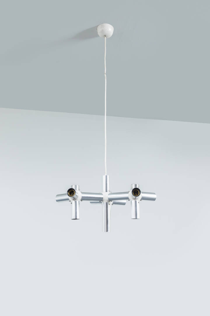 Lampadario composto da tubi in acciaio terminanti con luci.