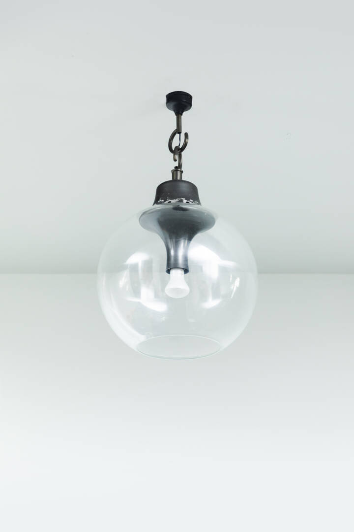 Lampadario in vetro trasparente, montatura in metallo brunito.