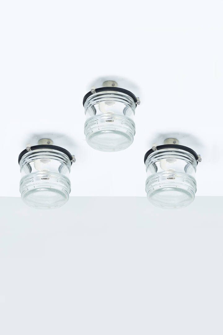 Tre lampade a soffitto in acciaio smaltato e vetro Freshel.