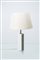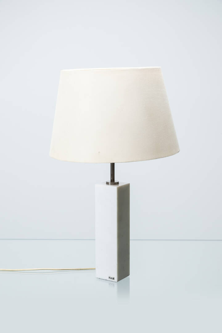 Lampada da tavolo in marmo bianco, metallo verniciato e paralume in stoffa.