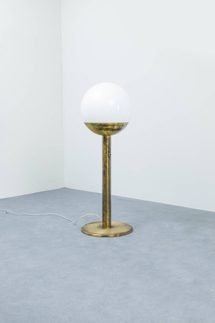 Lampada da terra in ottone, diffusore in vetro opalino.