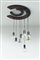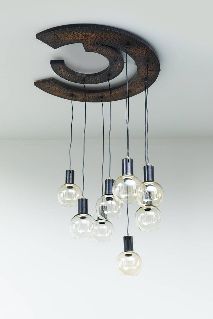Plafoniera in rame con otto sospensioni in caduta e diffusori in vetro trasparente.