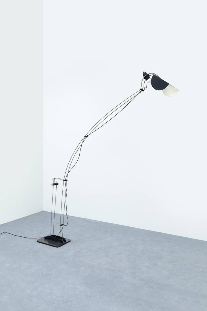 Lampada ad arco in metallo verniciato e metallo cromato.