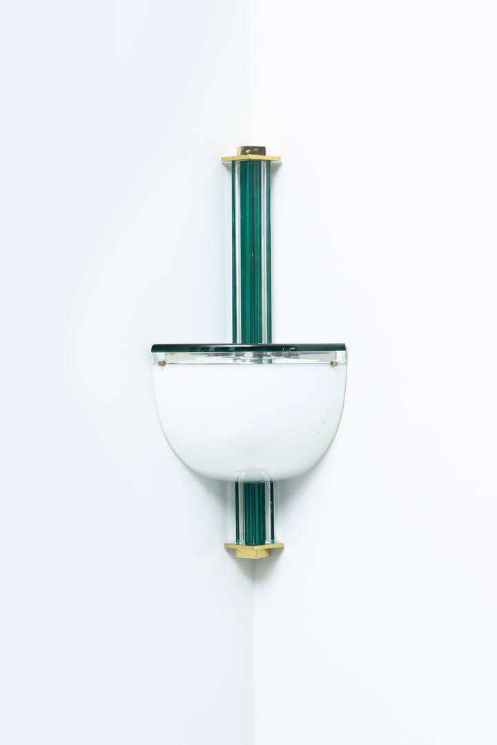 Lampada da parete angolare in vetro lattimo con anima in vetro colorato sommerso.