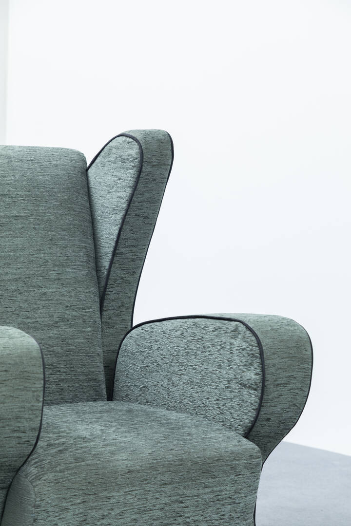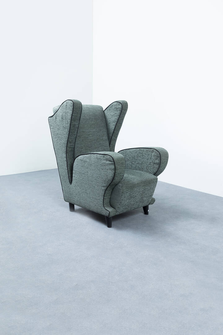 Poltrona in legno laccato e tessuto imbottito.