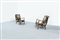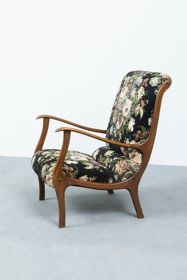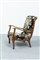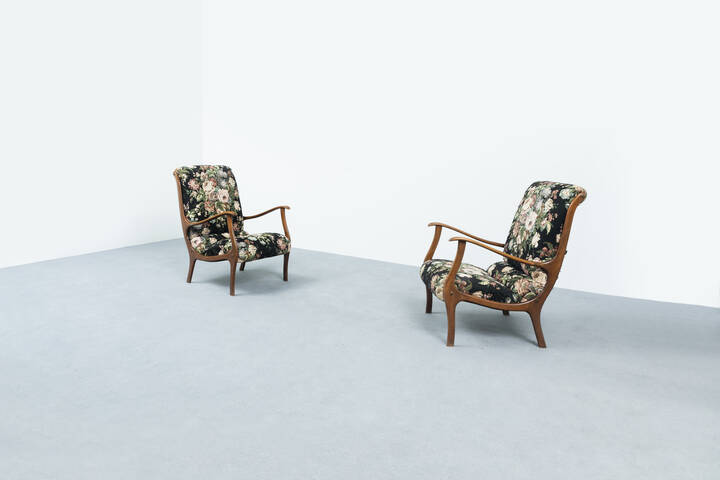 Coppia di poltrone con struttura in legno di mogano, imbottitura rivestita in tessuto ricamato.