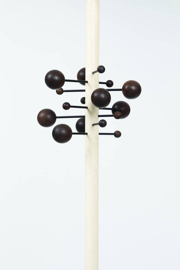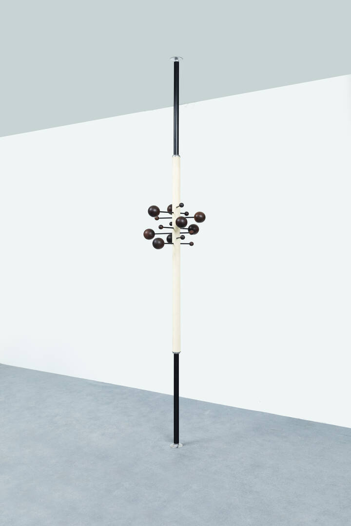 Appendiabiti a colonna in metallo verniciato, pelle e legni diversi.
