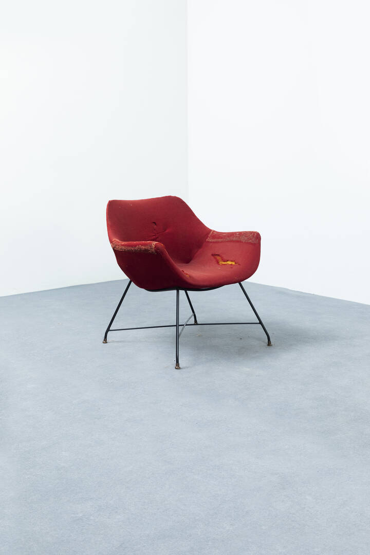 Poltrona con struttura in legno, imbottitura rivestita in tessuto, gambe in metallo verniciato.